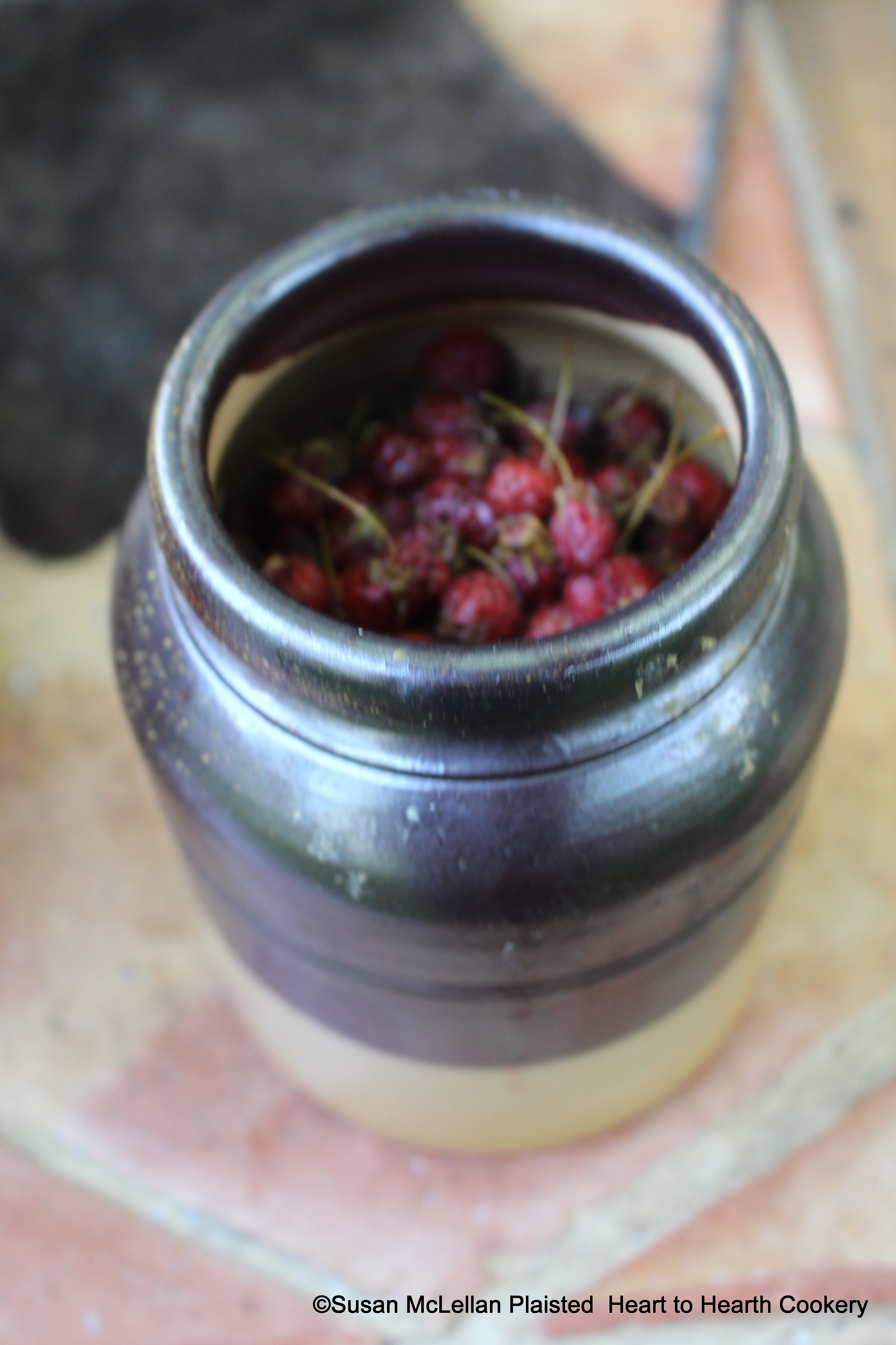 After taking each strawberry gently out of the hot syrup with a fork for the receipt (recipe} For preserving Strawberries put them into a stone pot for use.