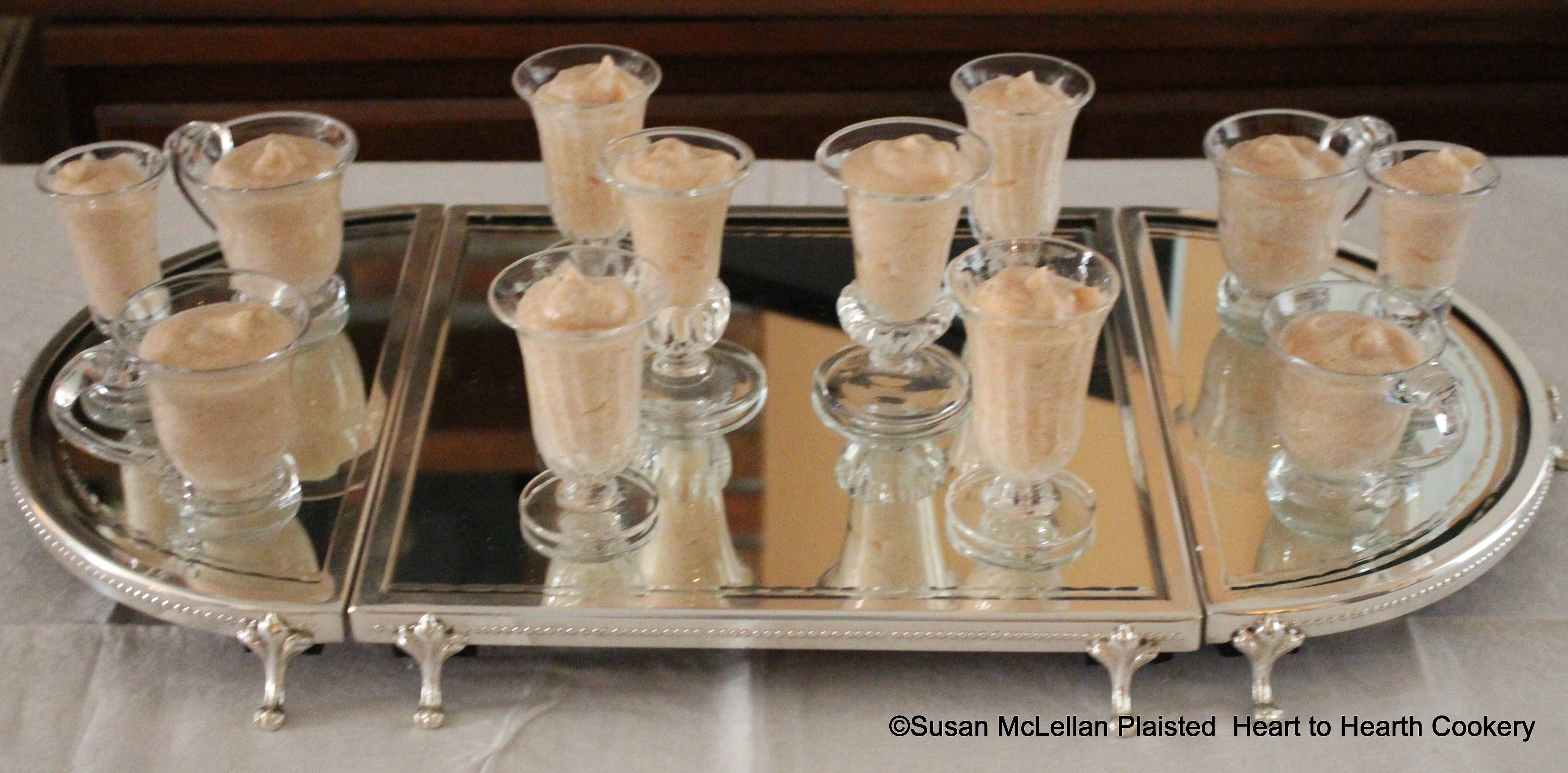 The receipt (recipe) Quince Cream made from mashed and sieved quince with sugar and egg whites was put in hand blown reproduction glasses and arranged on a mirrored plateau for serving.