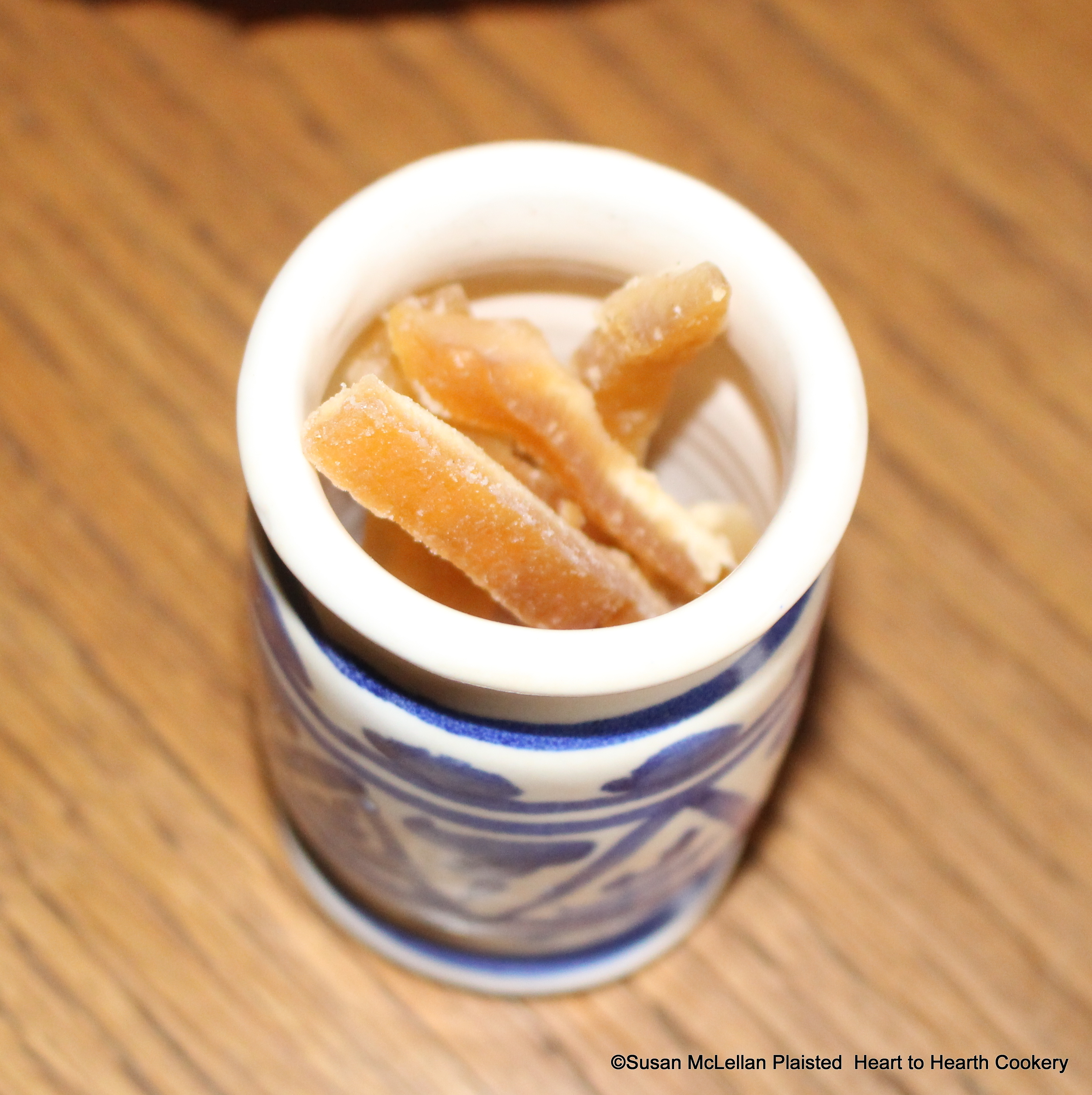 The next ingredient for the receipt (recipe) To butter Eggs in the Polonian Fashion is preserv’d lemon peel. The peel of lemons is preserved with sugar and stored in gally pots as the one pictured.