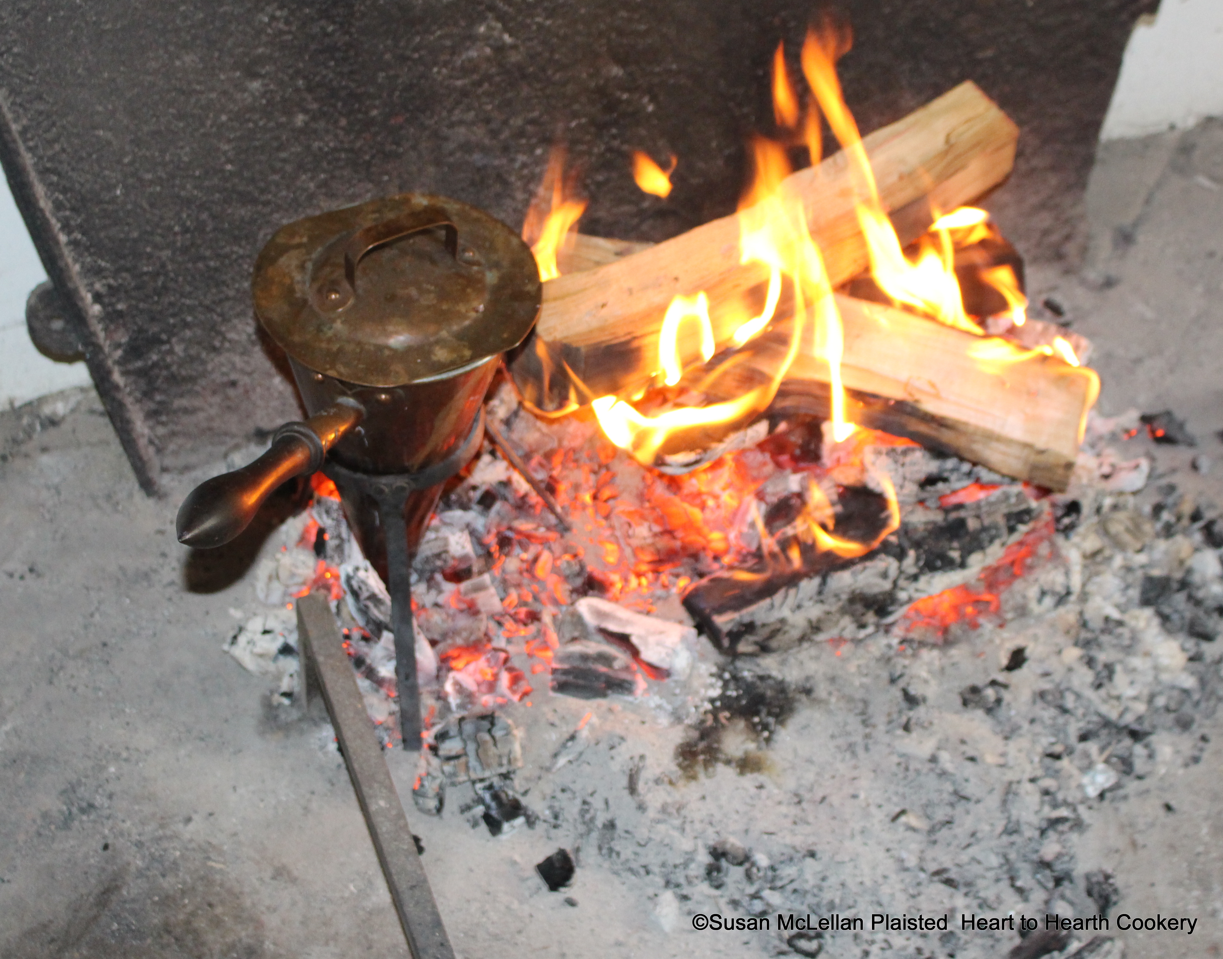 After the quarter pound of grated chocolate, quarter pound of sugar, half a quarter of an ounce of flour and a little salt are added to a quart of water for the receipt (recipe) To make Chocolate with Water, all was mixed and brought to a boil. The chocolate is in my reproduction mulling cone supported by a brandreth.