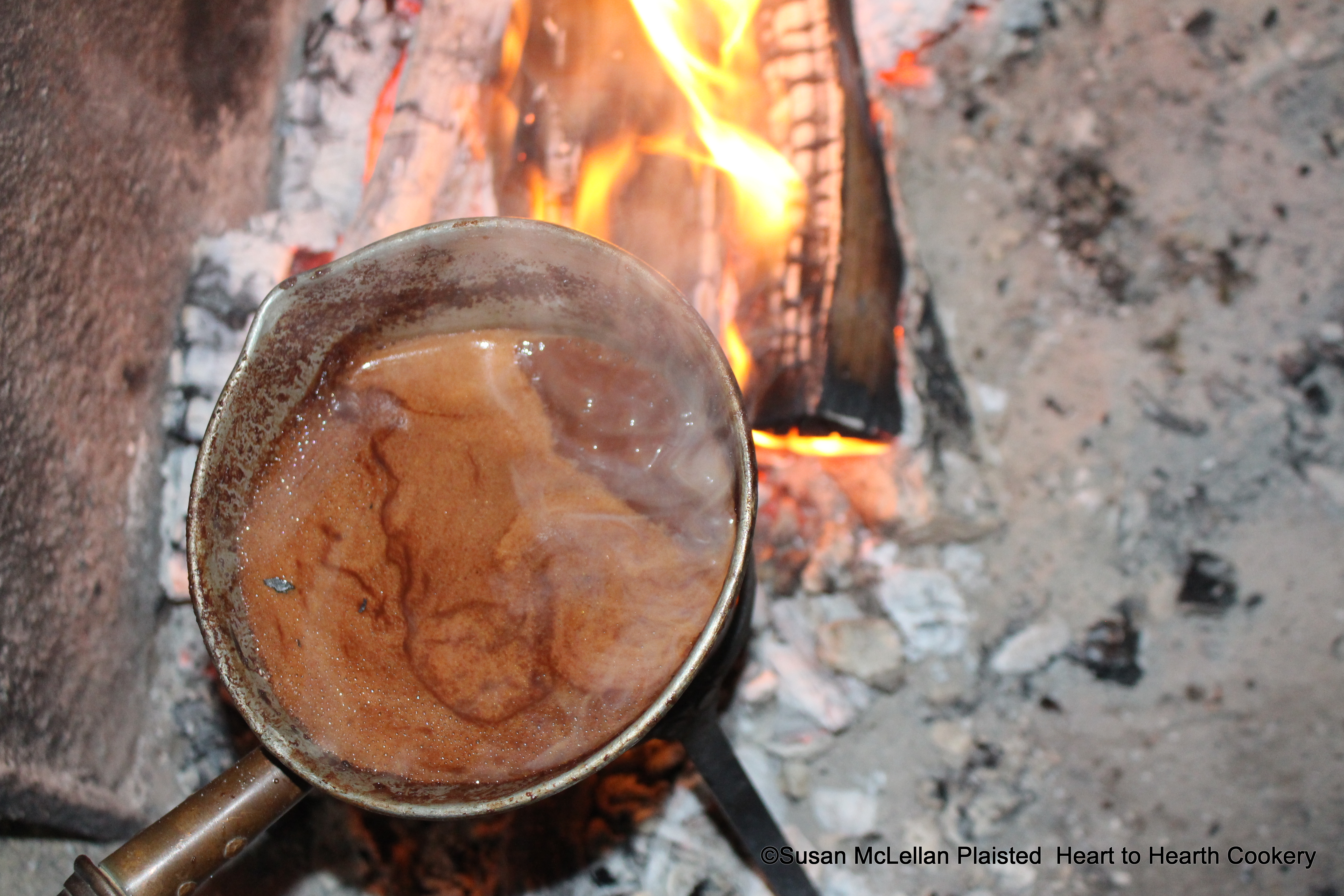 The receipt (recipe) To make Chocolate with Water has been boiled for ten to twelve minutes and is ready to be poured from my mulling cone into a chocolate pot for frothing.