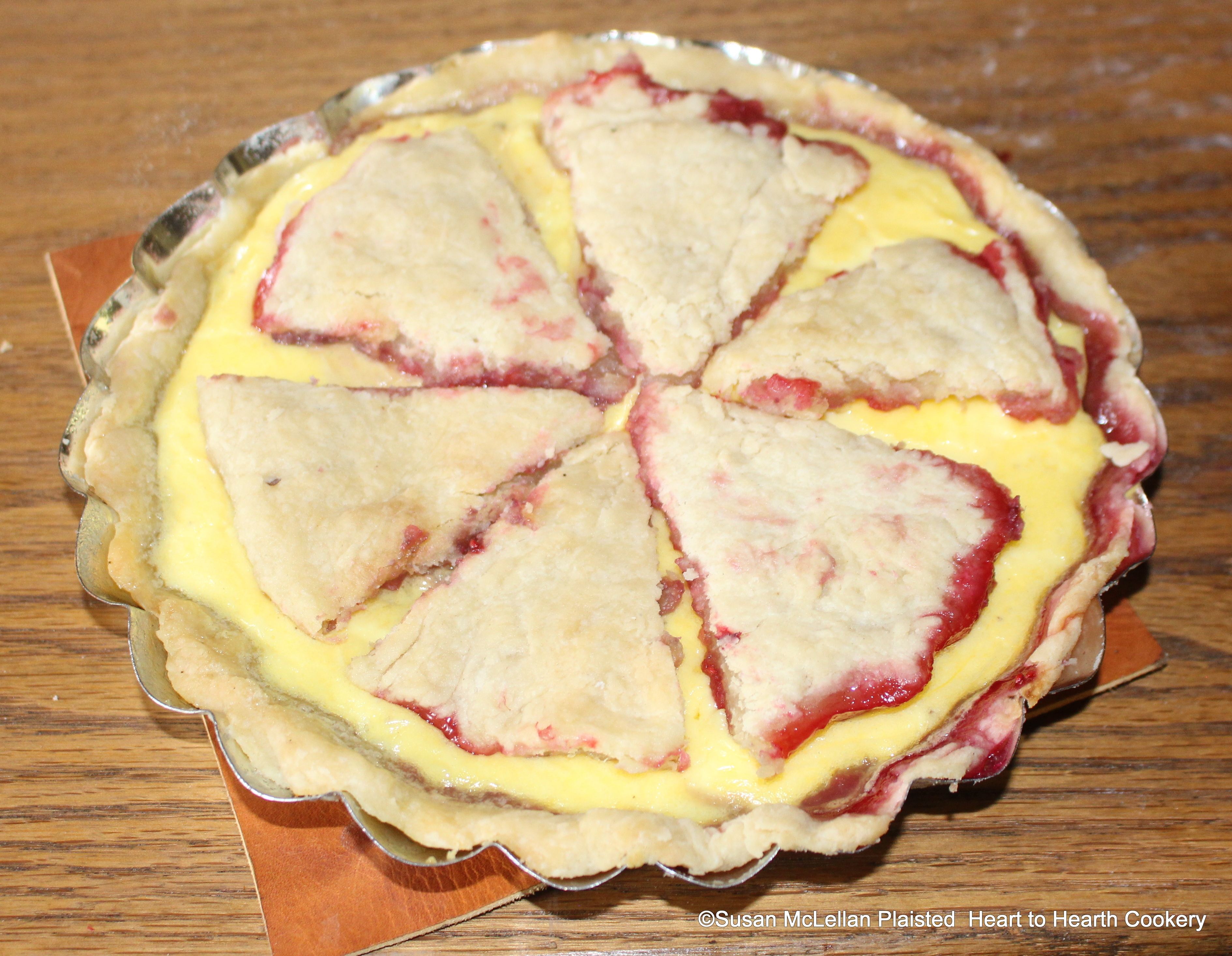 After the baking of the cream, egg yolk and sugar mixture for the receipt (recipe) To make a Rasberry Tart, let it stand till it is cold and the cut Puff-paste lid is laid on the cooled tart. The first baking was a layer of fresh raspberries strewed with sugar now covered with the custard and paste.