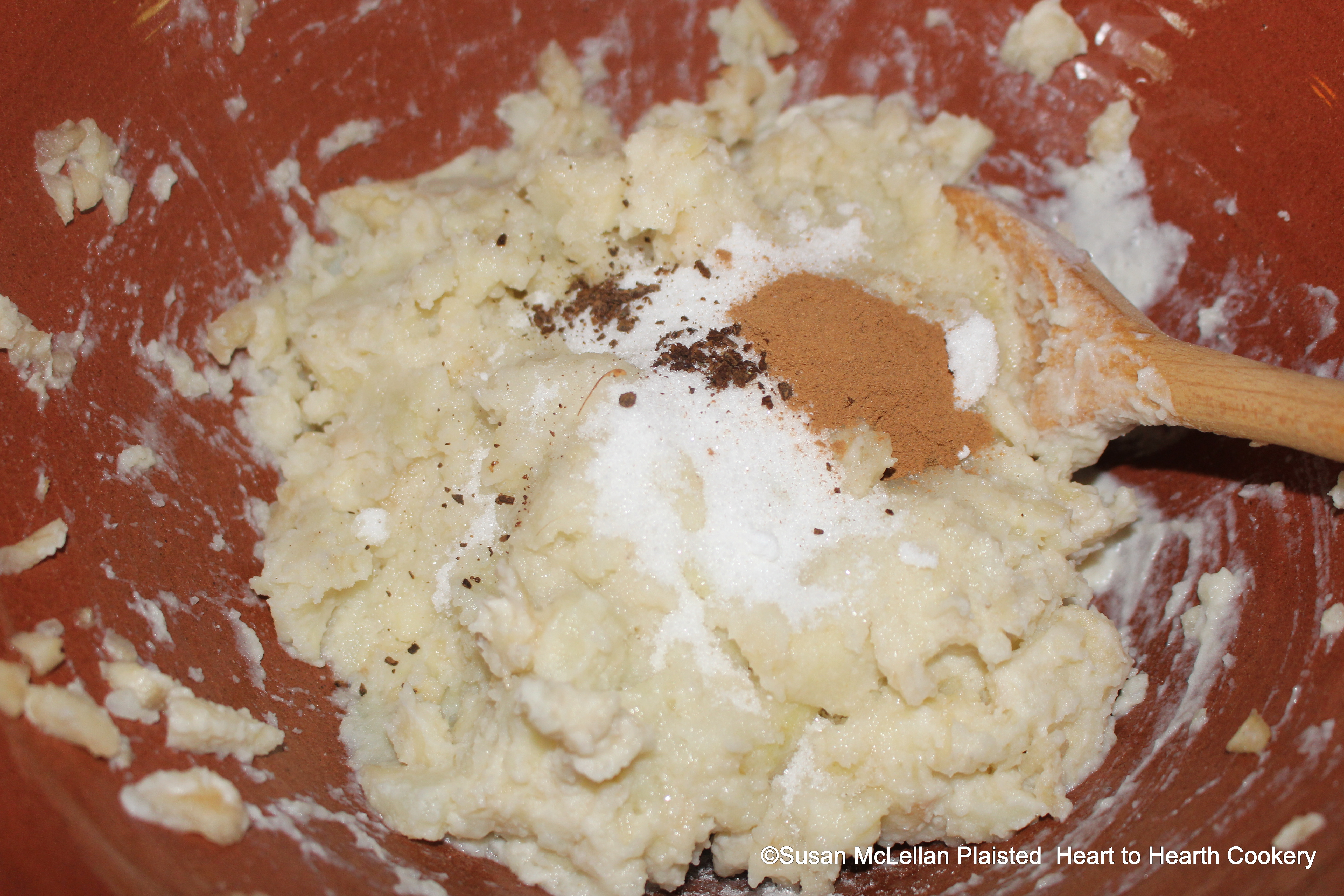 After the potato pulp, apples chopped small and cream have been mixed together for the receipt (recipe) To make Potato-Pudding, add some Loaf-Sugar, Powder of Cinnamon and Cloves.