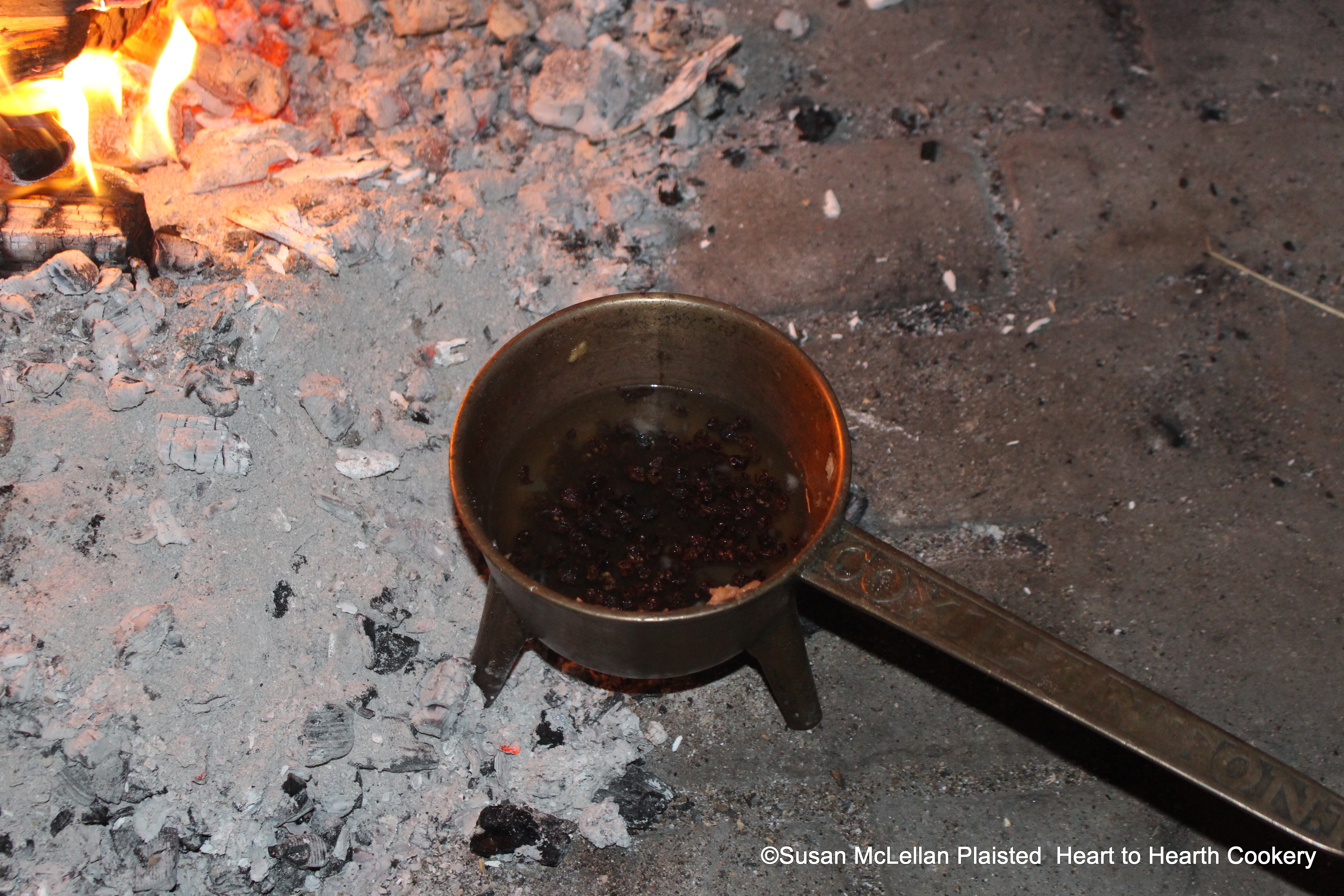 After the manchet bread has been toasted for sippets for the receipt (recipe) To Butter Onions Otherways boil currans (currants) that will be mixed with butter and sugar. The currants are being boiled in a posnet.
