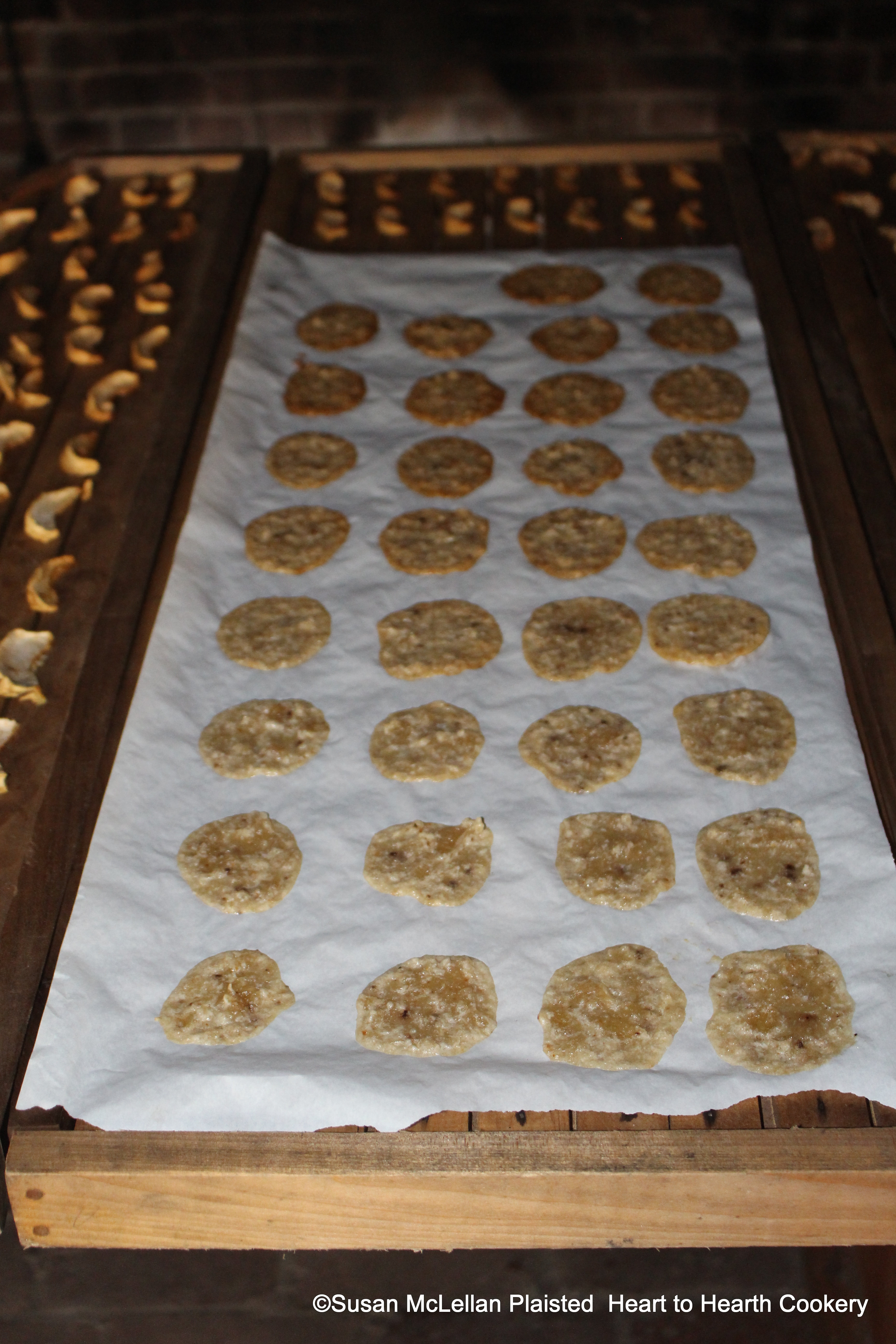 The next morning the receipt (recipe) To make Biscuits of Potatoes (a confection) and the apples slices that were placed in the slack bake oven after a baking day were both dried perfectly. The biscuits are now ready to be removed from the white paper and stored in wood boxes until needed to impress guests at a banquetting table.