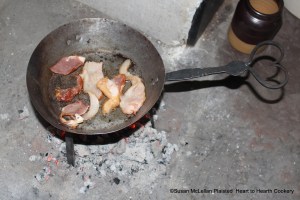 The schpeck (bacon) is being fried crisp for the receipt (recipe) Heese Schpecksass (Hot Bacon Sauce) to serve on the fresh dandelions. This is a traditional Pennsylvania German spring receipt.