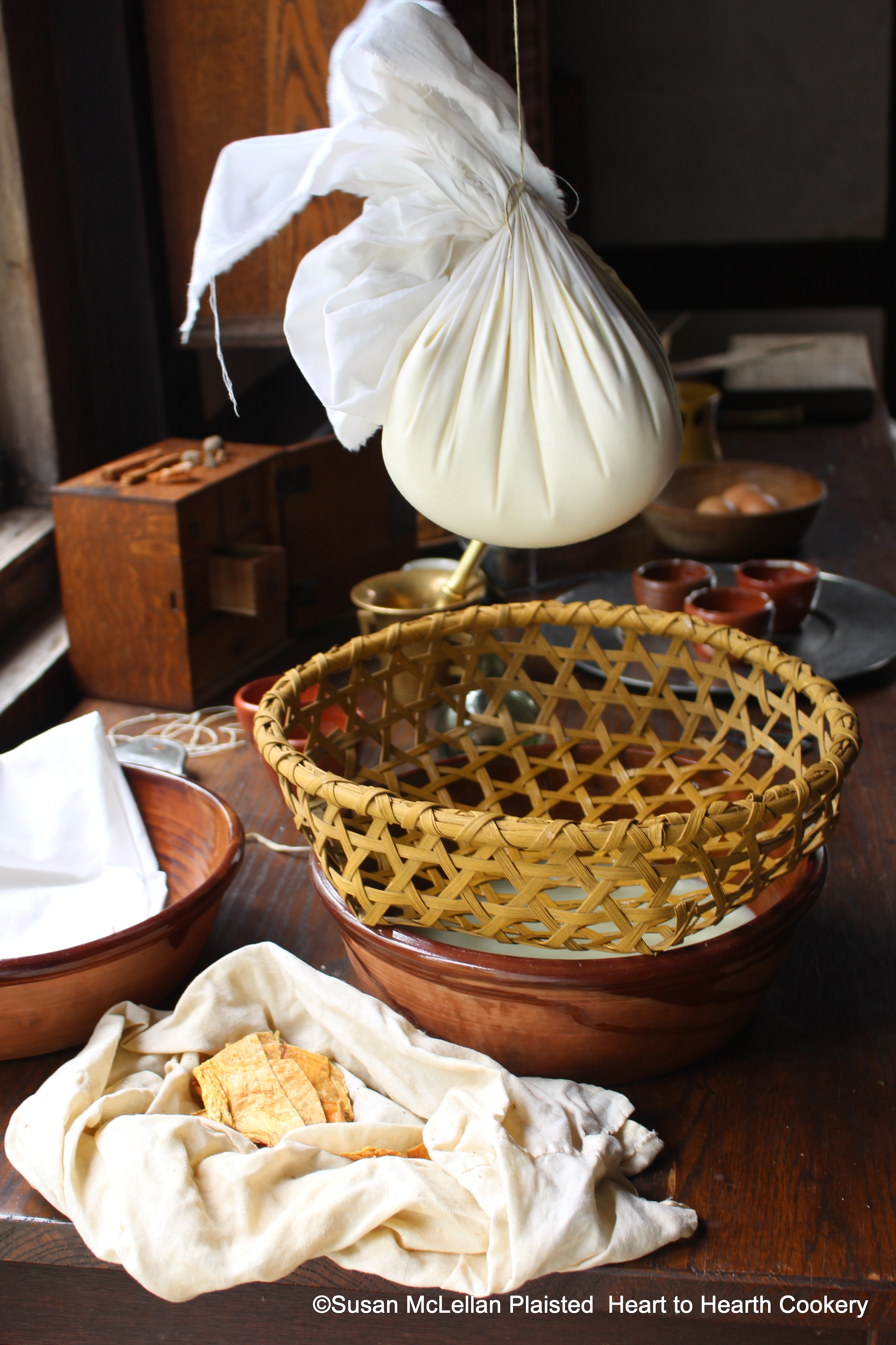 After the morning milk has been heated blood warm and set with rennet for the receipt (recipe) To make Cheese and Cream the curds are cleansed from the Whey first by draining the curd in a linen cloth placed in a cheese basket and then by gathering the curd in the cloth and hanging it to get the remaining whey drained.
