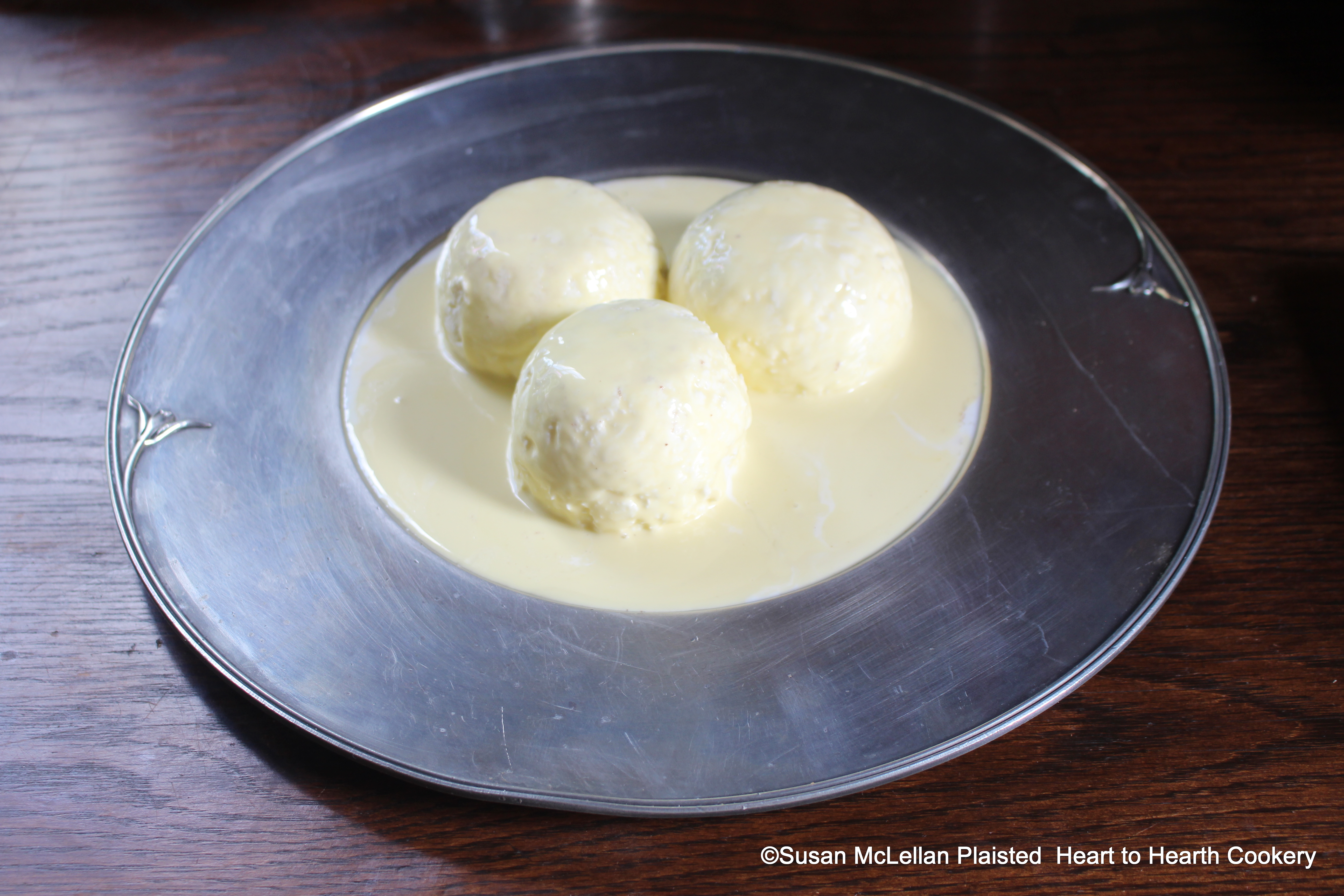 After the sauce prepared by boiling cream with whole cinnamon, whole mace, quartered nutmeg, egg yolks and rose-water has cooled for the receipt (recipe) To make Cream and Cheese put it in with your Ladle between the said Cheeses.