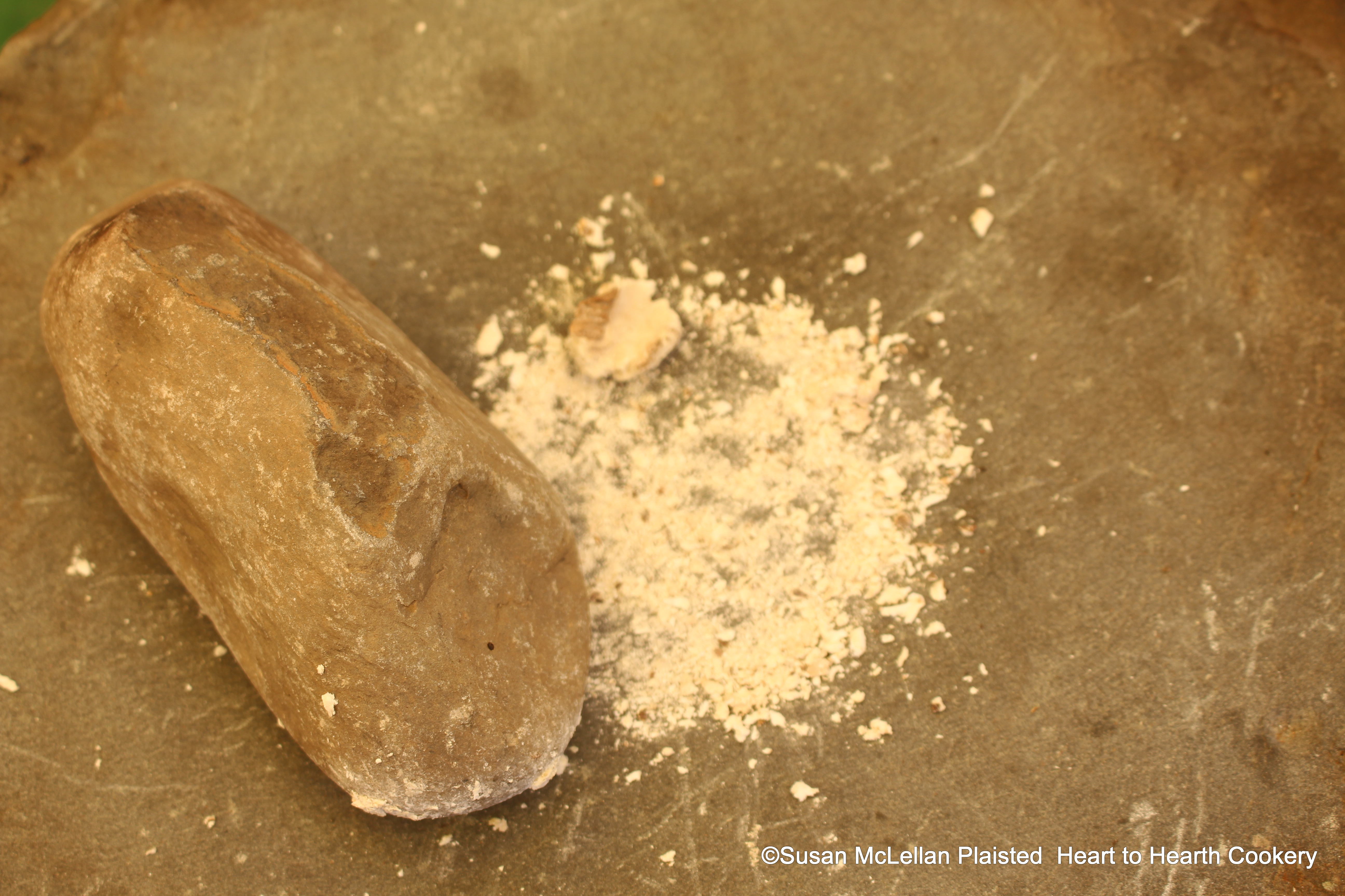 After the early spring sunchoke tubers have been dried in the sun, the dried sunchoke pieces were pounded into flour on a stone mortar with a stone pestle for the receipt (recipe) described by European settlers as sunchoke bread.