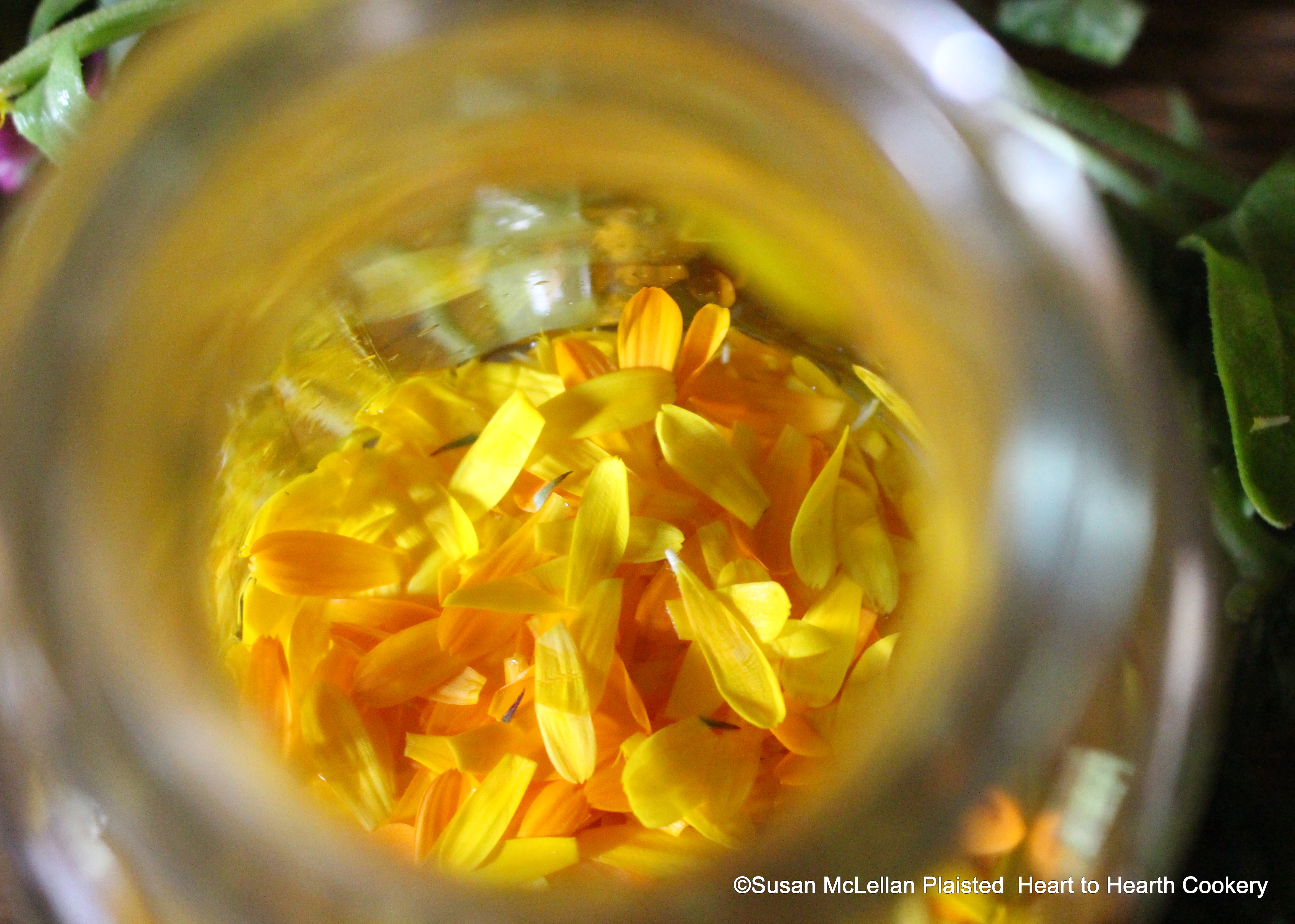 After the whites have been clipped from the calendula petals for the receipt (recipe) To pickle Calendula put them in a glass.