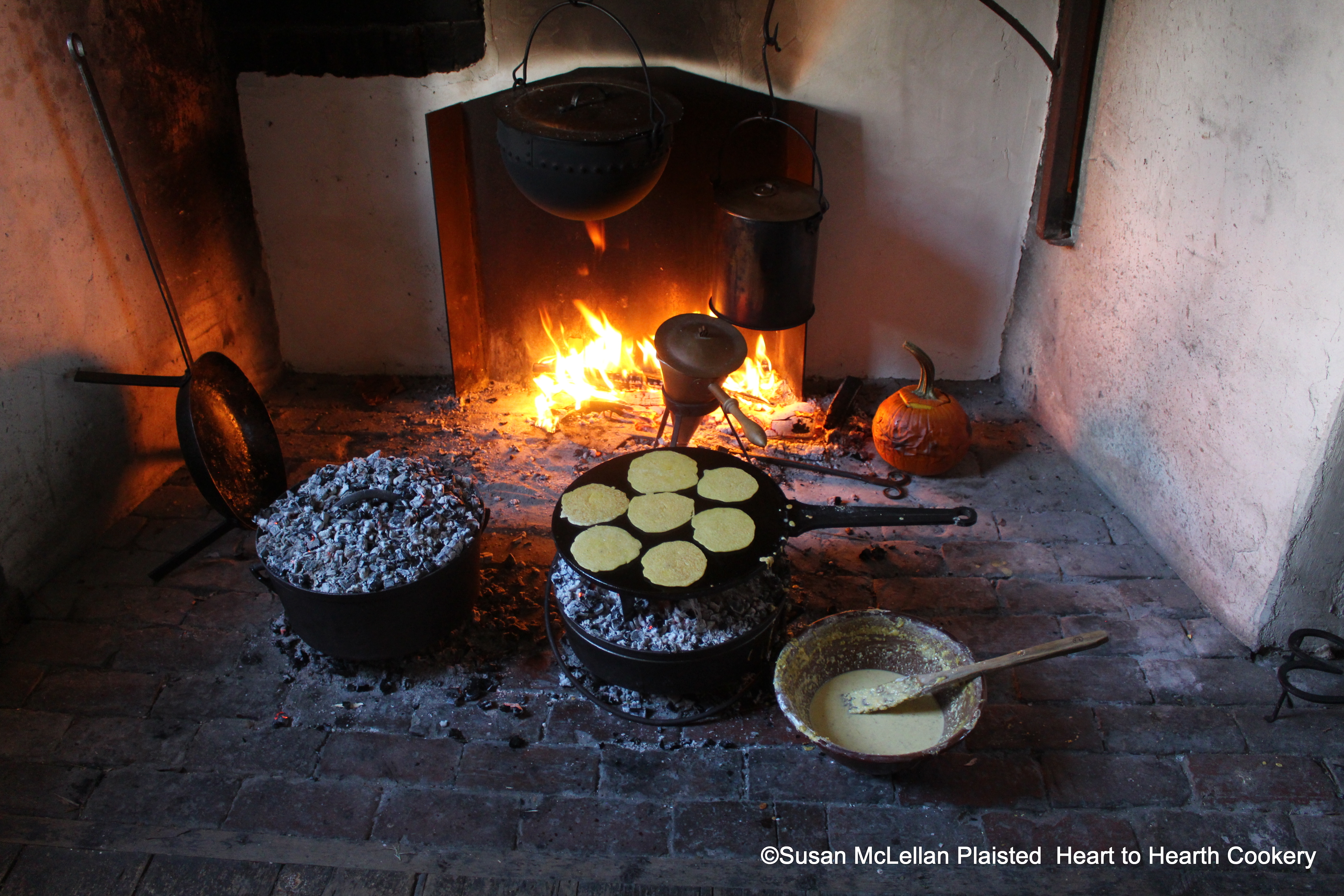After the top paste (pastry) is added to the receipt (recipe) To make a Pompion Pye, it was baked in a bake kettle at the hearth. The pie is inside the kettle (to the left of the picture) which is sitting on a bed of embers and with embers on the lid to create an oven.