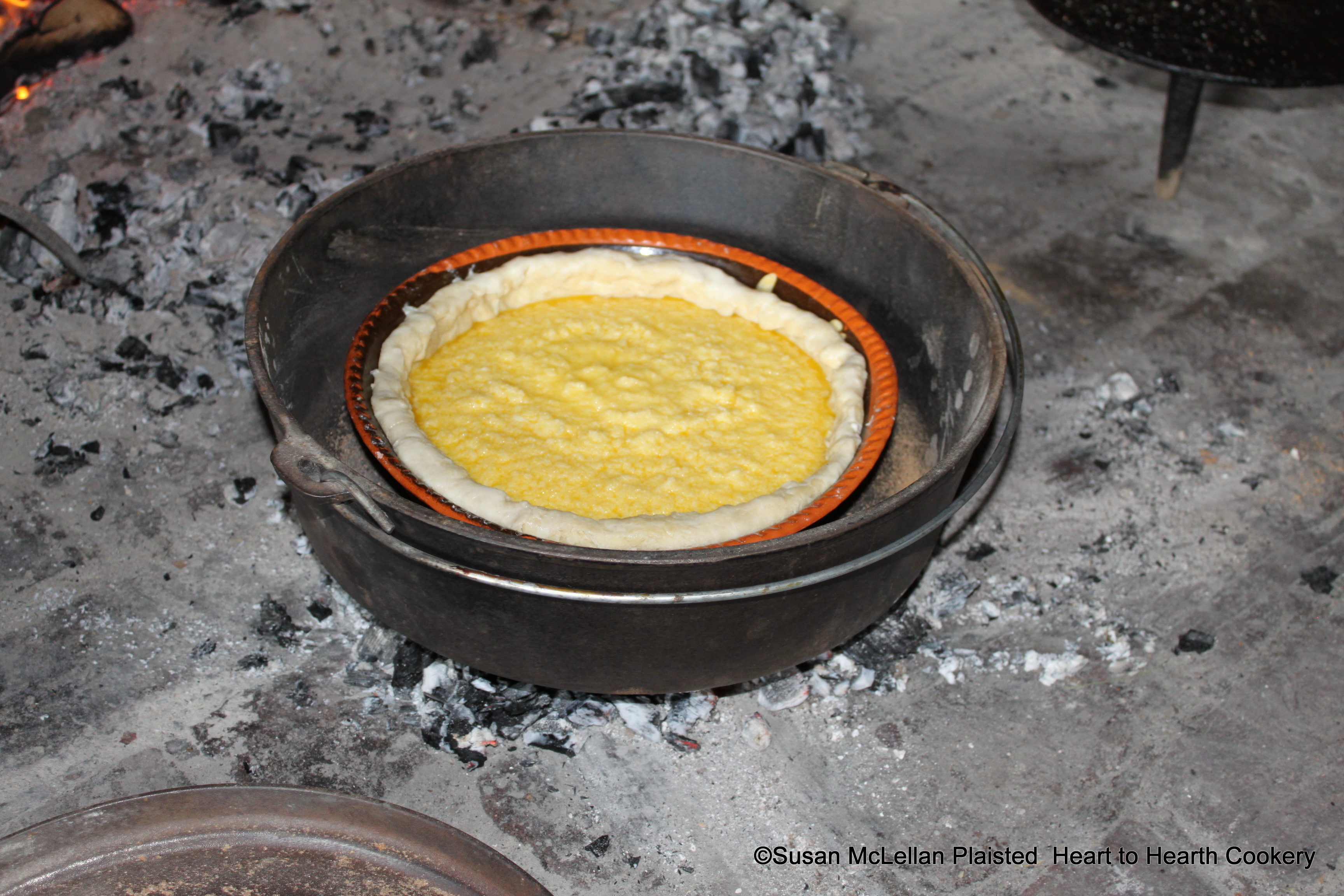 The receipt (recipe) Lemon Tart from the manuscript receipt book of Hannah Marshall Haines was placed in a bake kettle on embers for baking. The lid, where more embers will be laid, is to the bottom left of the picture.