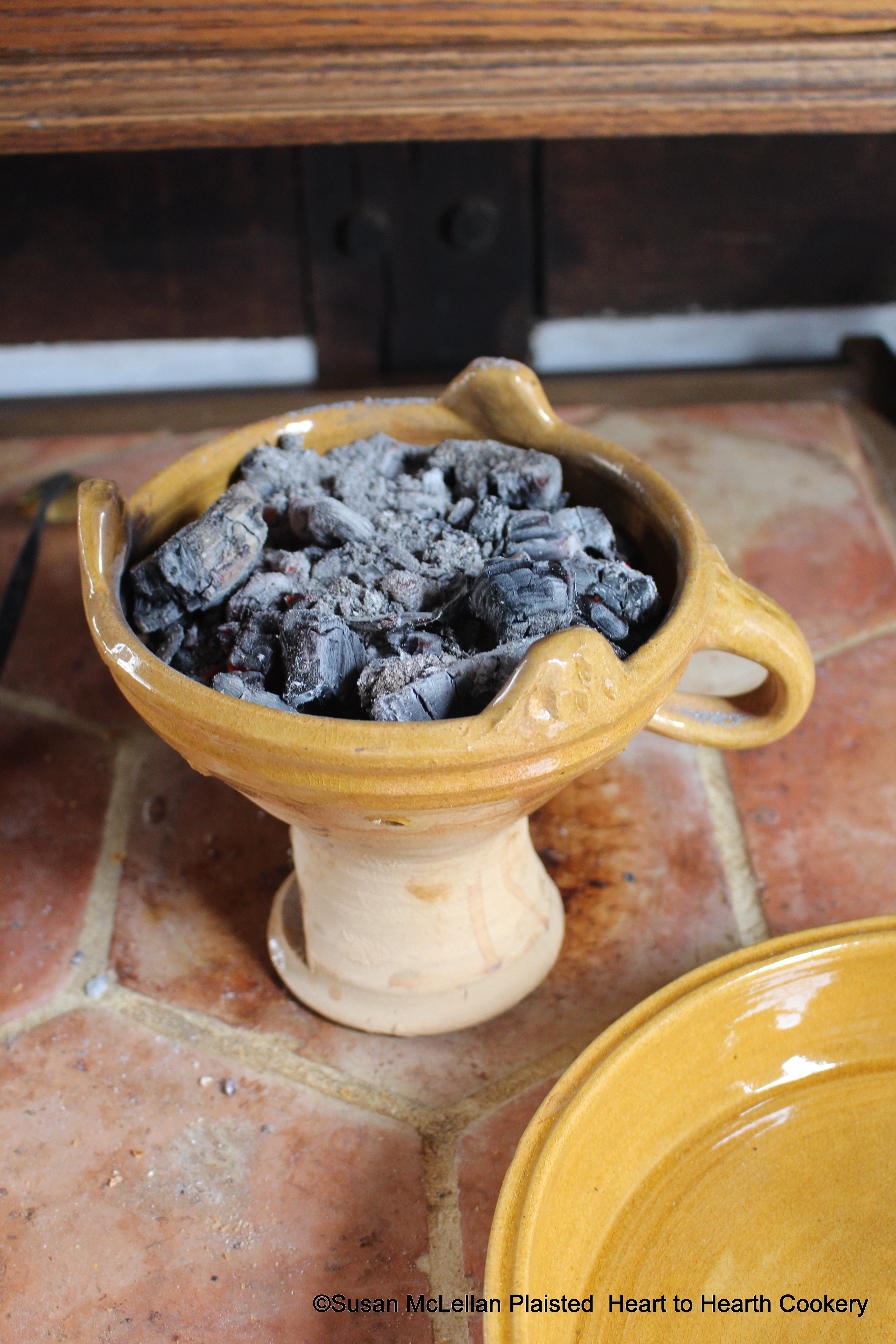 A chafing dish in the 17th century was a portable dish to hold burning embers or coals for receipts (recipes) that required more delicate heat away from the heat of the main hearth fire. Pictured is my reproduction ceramic chafing dish filled with embers in preparation for the cooking of the receipt To dress Eggs in the Spanish fashion.