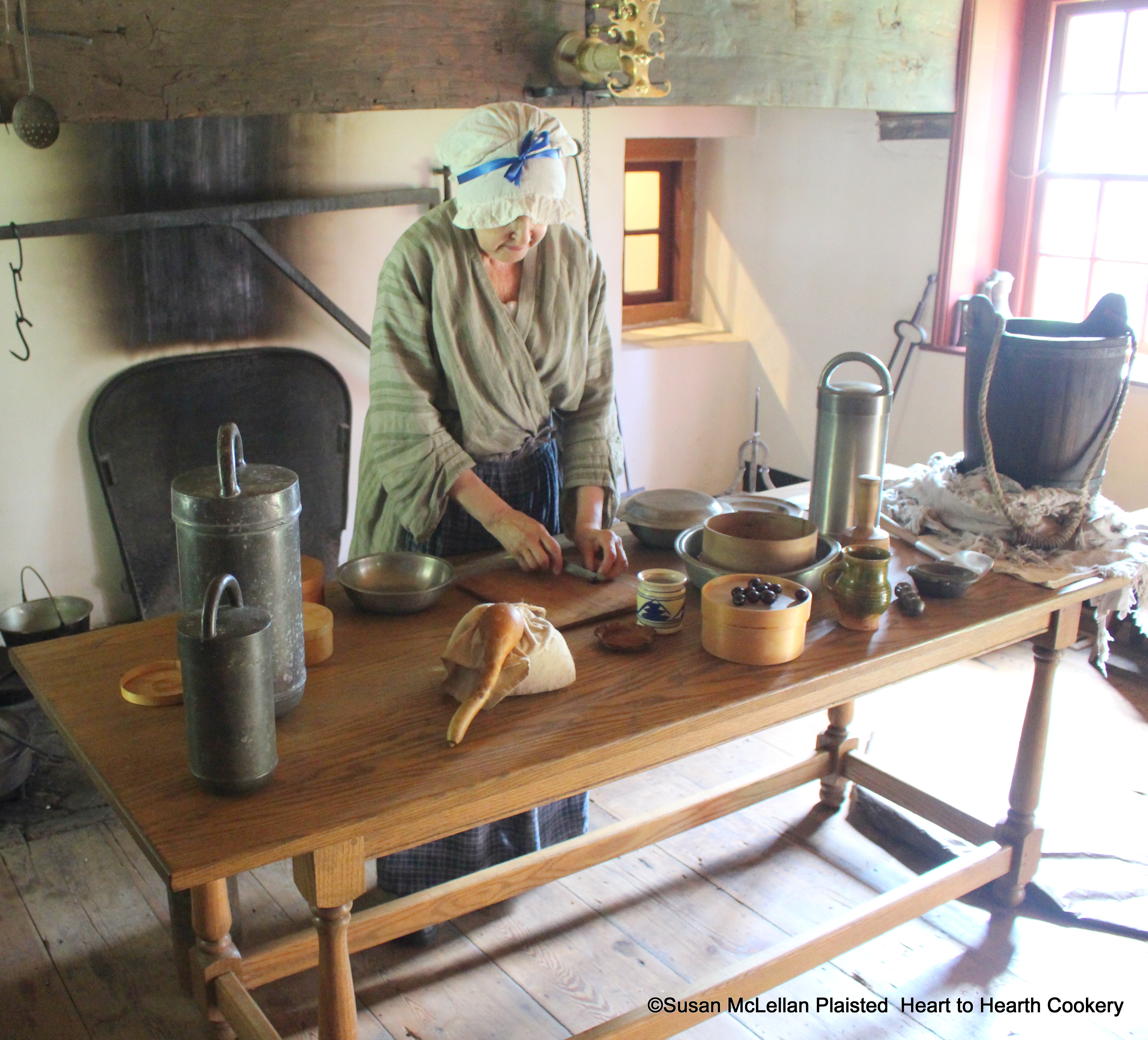 My table is ready for the receipt (recipe) To make Gooseberry Cream Ice which would be referred to as gooseberry ice cream today. From left to right on the table are two original sabotieres, a bag of salt and gourd spoon, a sieve with a few very ripe gooseberries remaining from my preserving fresh picked ripe gooseberries a month prior, a gally pot of preserved gooseberries to be used in the ice cream which were strained through the sieve, a second sieve in a pewter basin, a wood masher, my reproduction pewter sabotiere and coopered bucket ready for the ice and salt.
