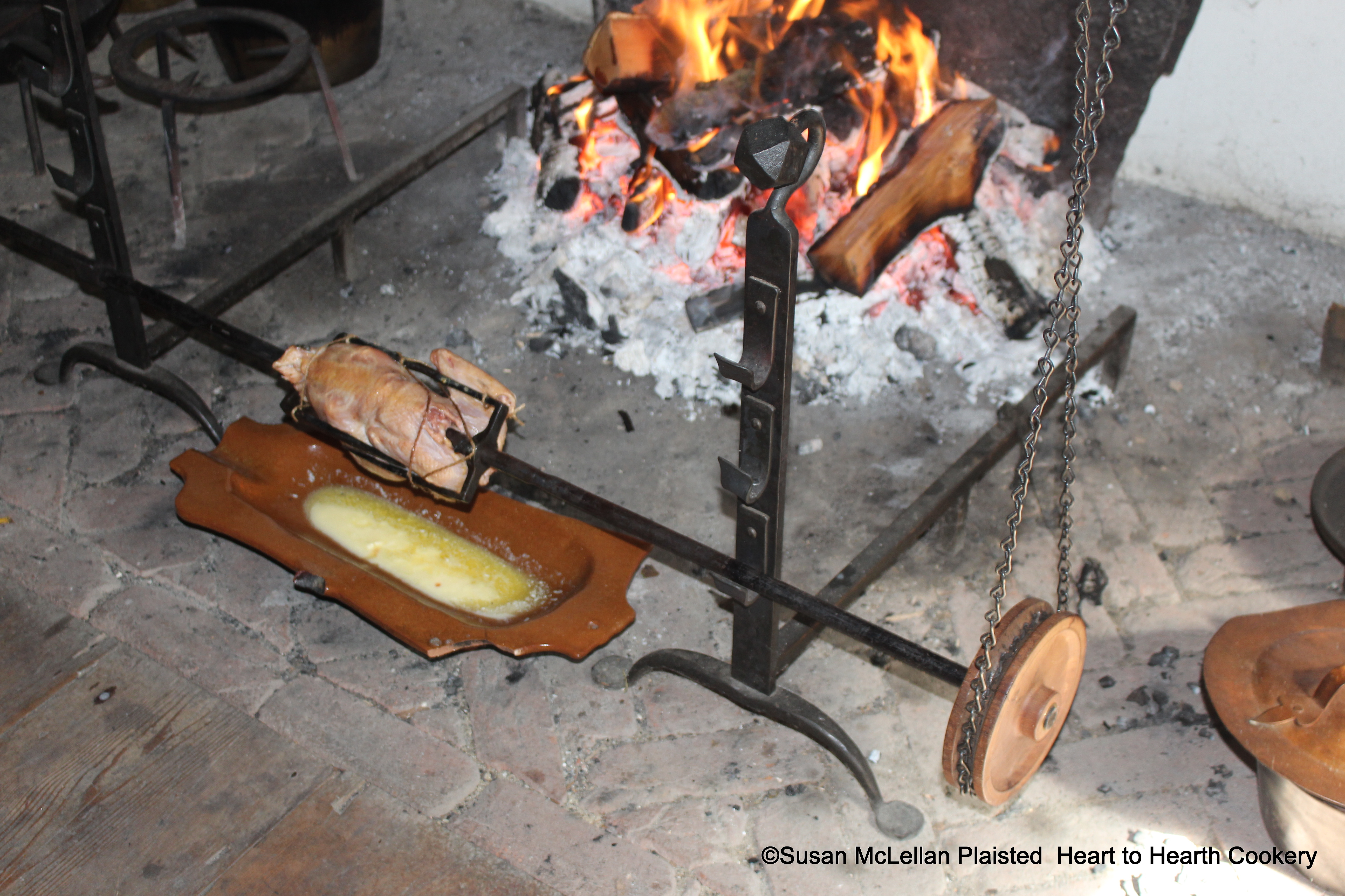 After the pheasant was larded with bacon, breast papered for the receipt (recipe) To roast Pheasants the spit was placed on the lowest level of the spit dogs and a redware grisset set underneath the bird. While roasting the pheasant was basted with butter and drippings from the grisset.