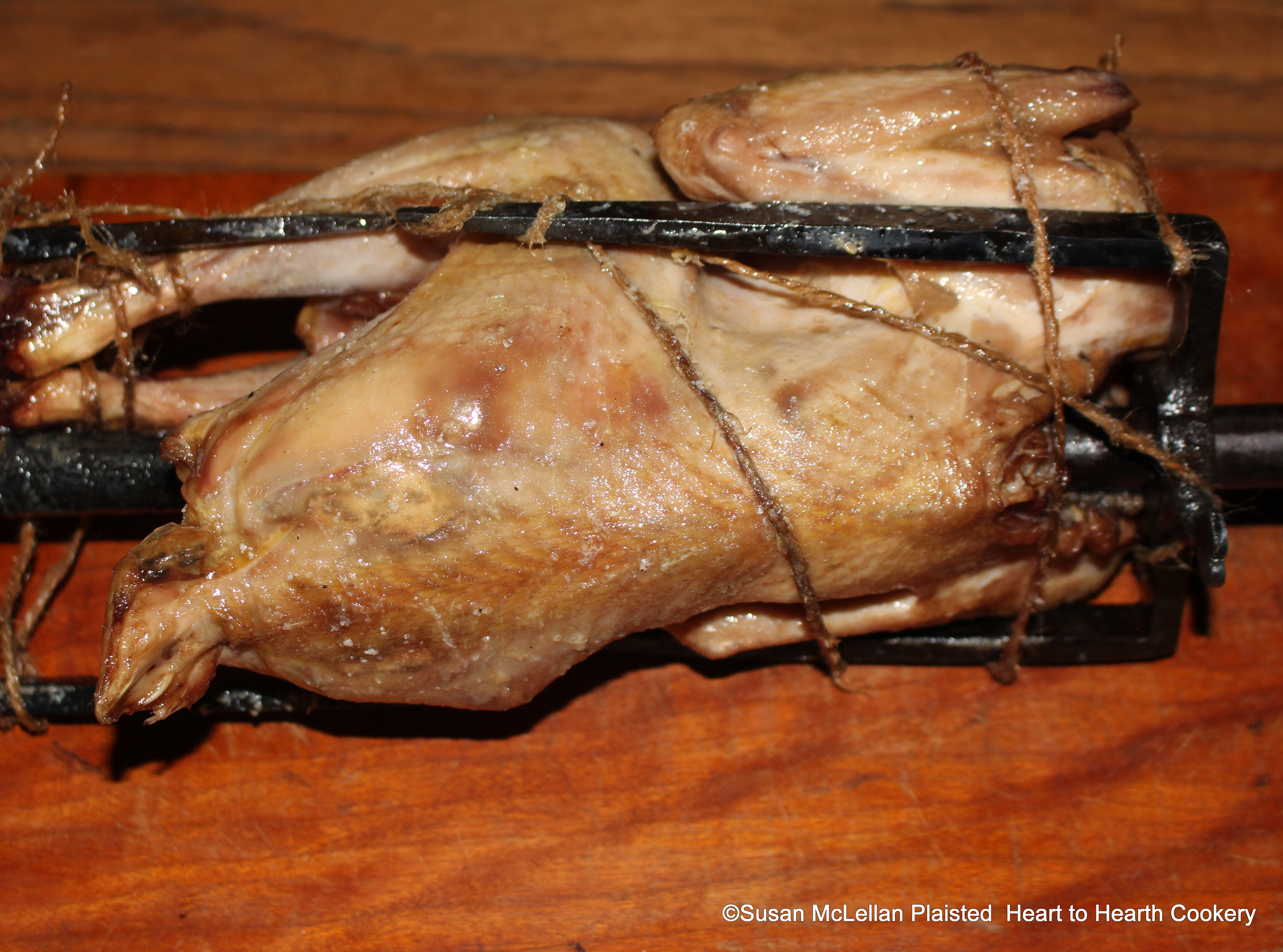 The pheasant roasted using a clock jack spit using Hannah Glasse’s receipt (recipe) To roast Pheasants is now ready to be removed from the spit and served to table. The good gravy from the redware grisset will be poured in a dish with bread sauce in boats or basons.