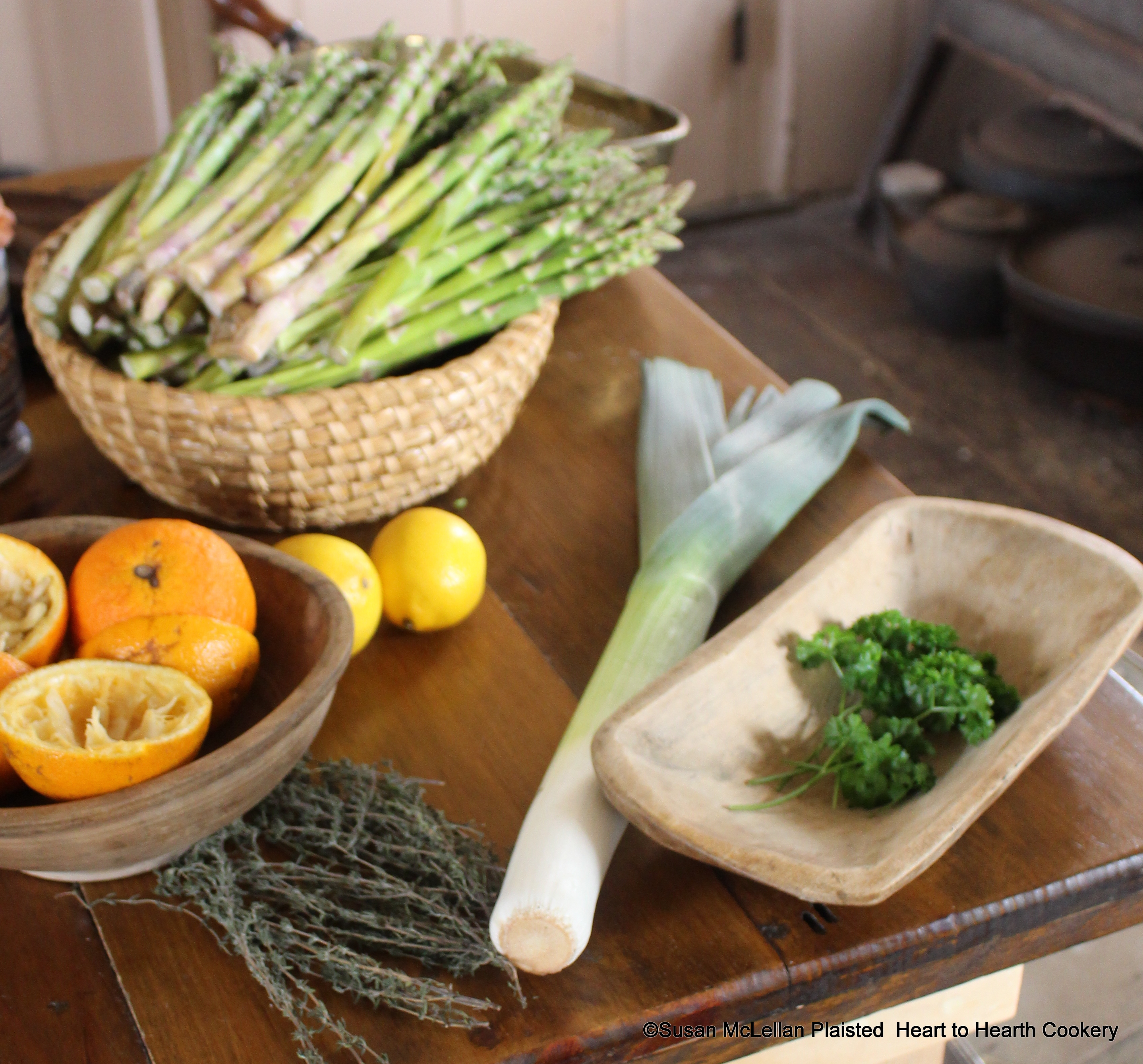 The asparagus, leek and herbs (thyme and parsley) are ready on the table for the preparation of a 1702 receipt (recipe), An Asparagus-pan-pie.