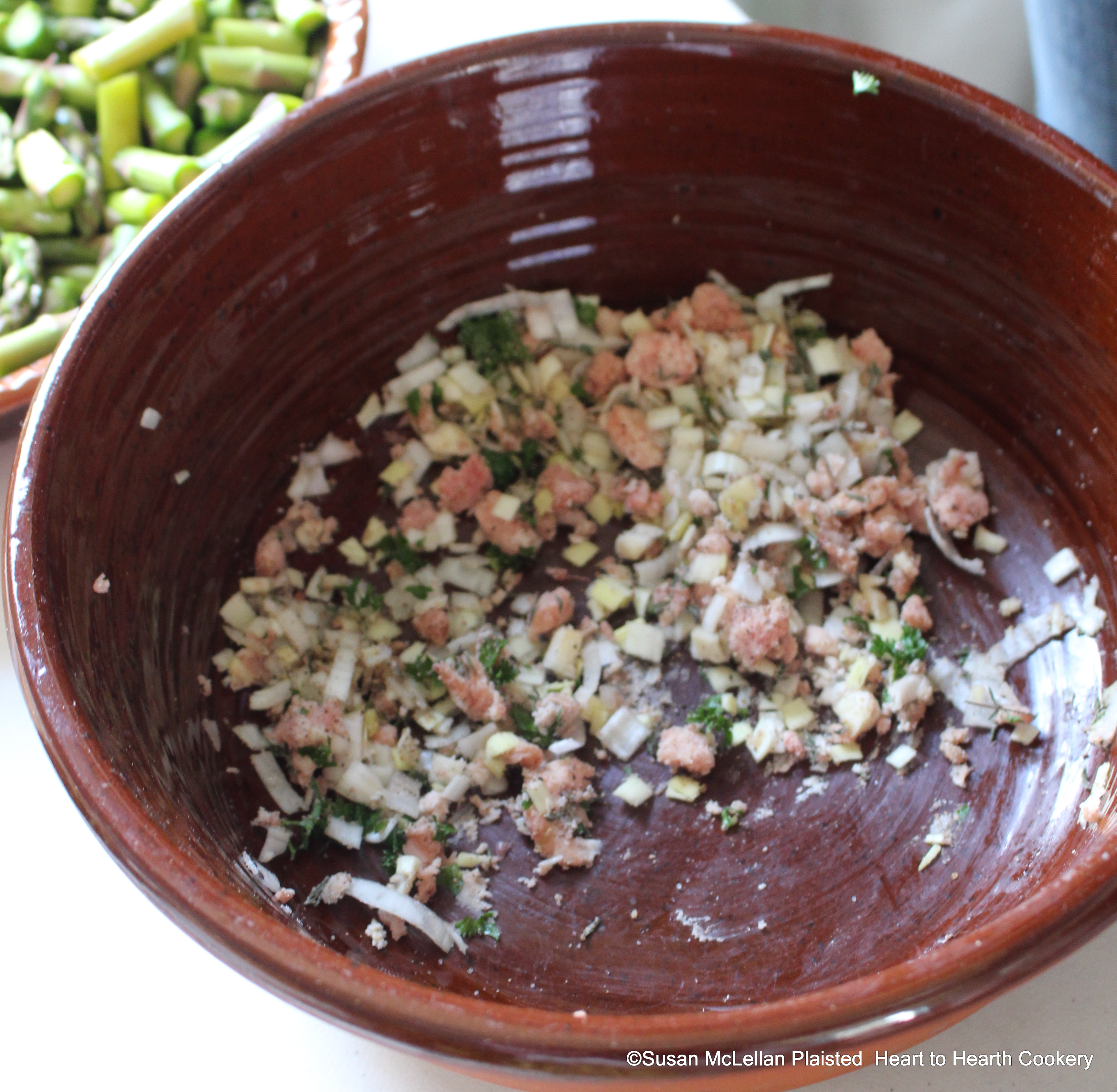 After the marrow has been removed from the marrow bones for the receipt (recipe) An Asparagus-pan-pie herbs (thyme and parsley), chopped leeks, salt, pepper and nutmeg are added to dress the asparagus.