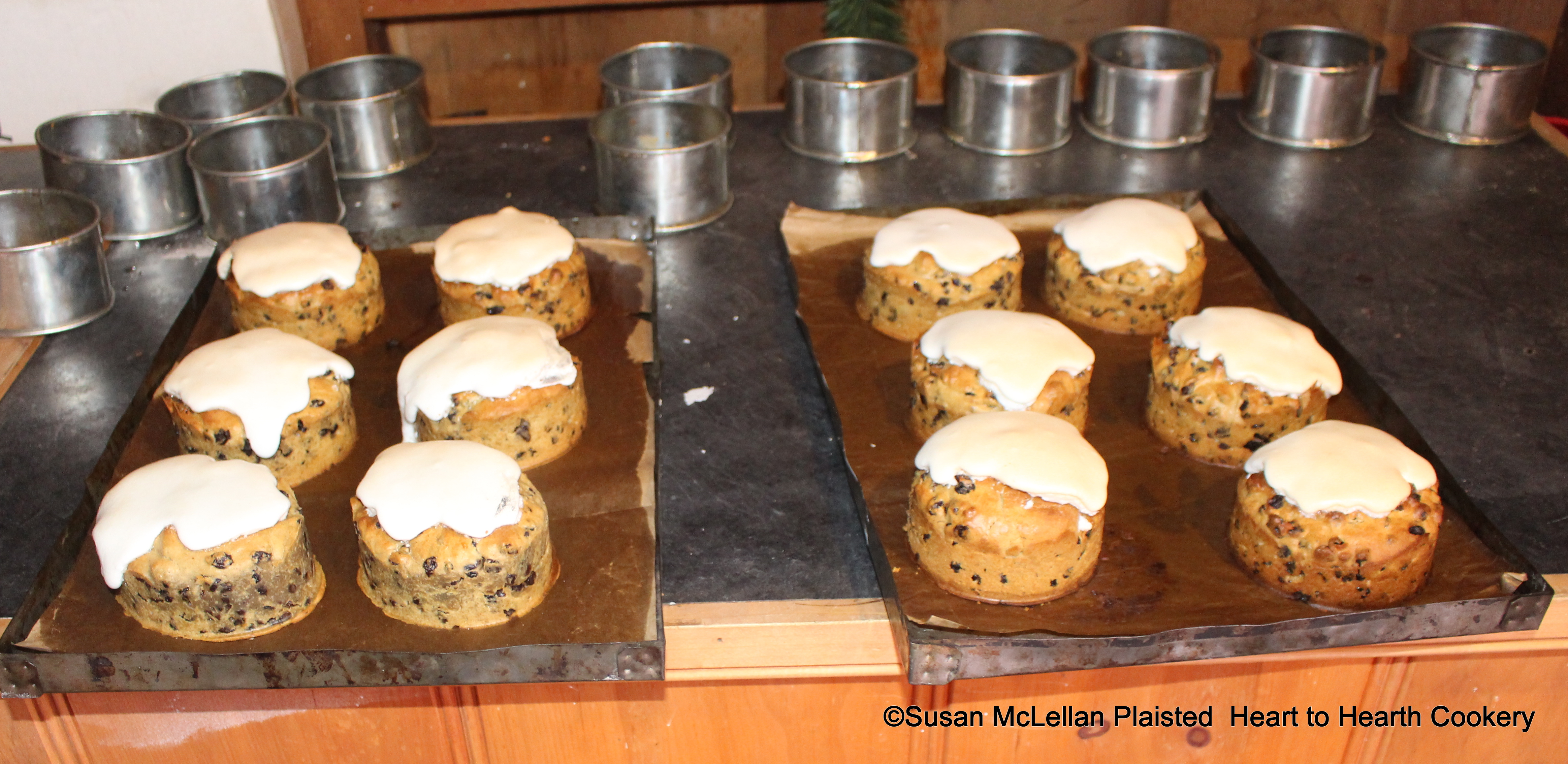 After the individual, small cakes had their cake hoops removed and before they completely cooled, an icing (made from egg white whisked stiff, fine double-refined sugar and rose water) was applied for the receipt (recipe) A Pretty Cake. The tin baking pans are then placed back into a cooler bake oven for a very short time for the icing to set. The icing needs to be more white than attain much brown color.