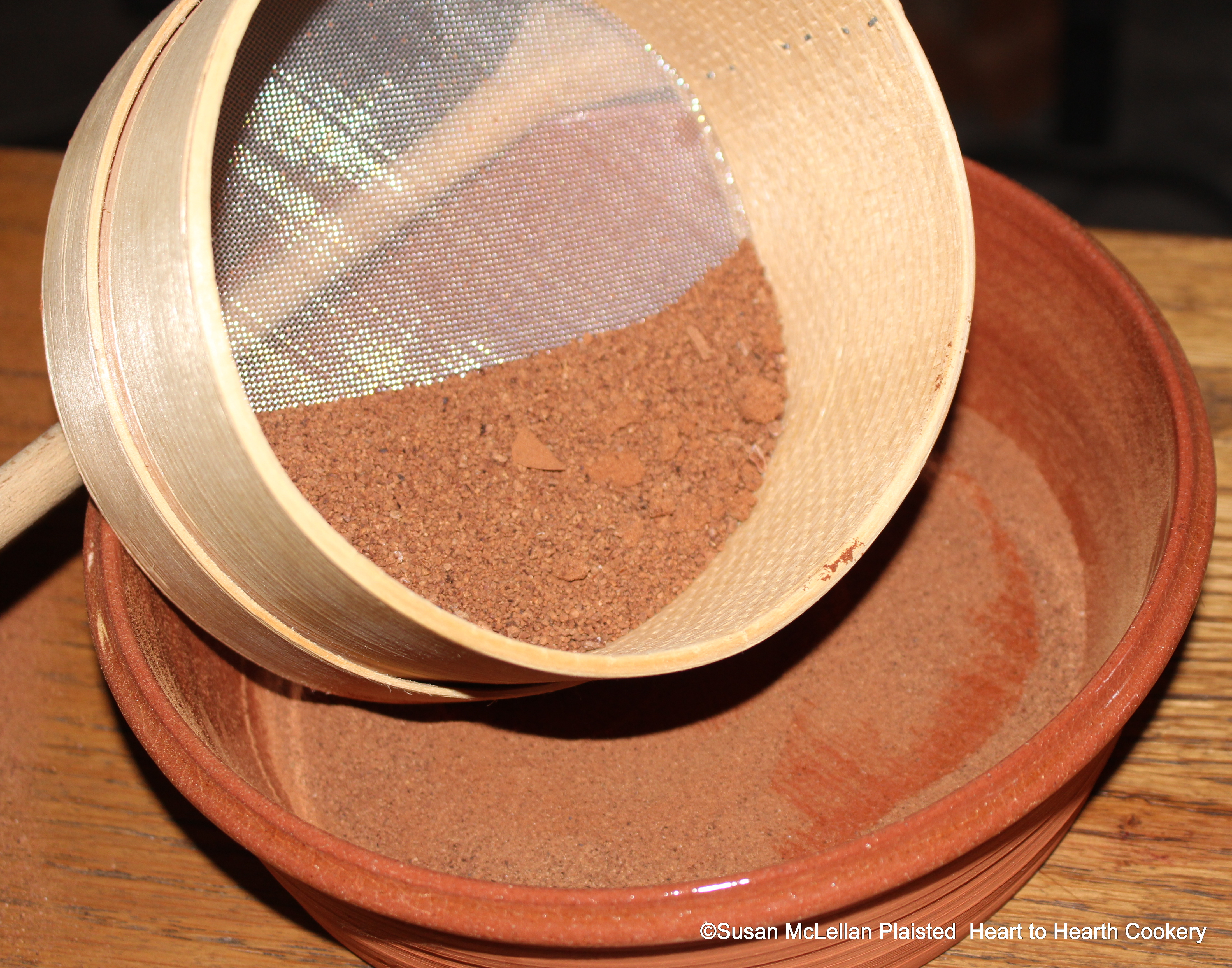 After the cacao nuts have been finely beaten in a mortar and pestle for the receipt (recipe) To make Chocolate they are searced. The process of searcing is sieving but typically the word sieve was the term for agricultural uses in the 17th and 18th century and the term searce was reserved for cooking.