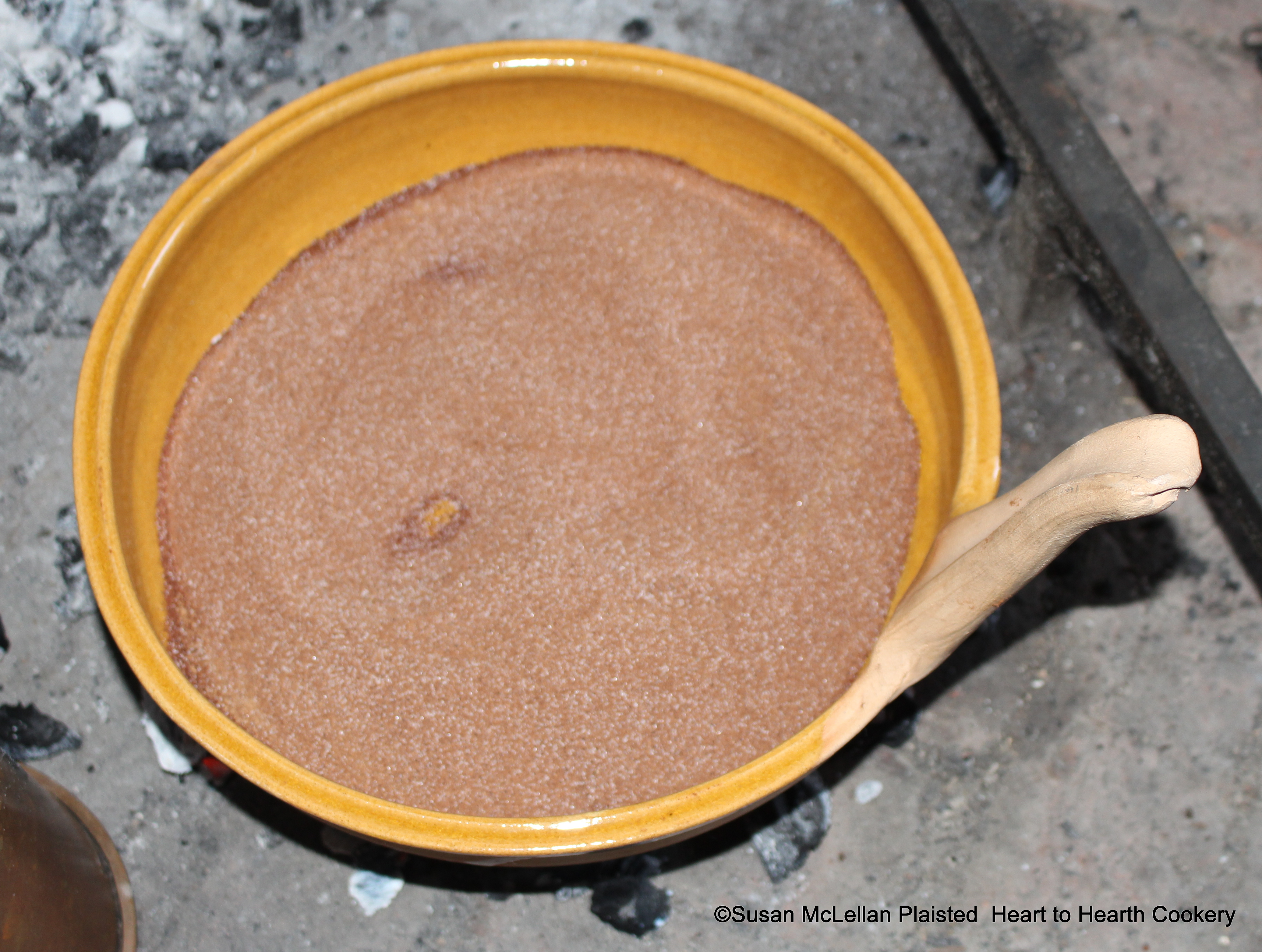 When the cacao nuts, spices and vanilla are well mixt for the receipt (recipe) To make Chocolate heat and beat in an earthen pan till they are as hot as you can endure ye finger in it. My finely searced ingredents are in my earthen pan on a small bed of embers and they must be continuously stirred until all are very hot.