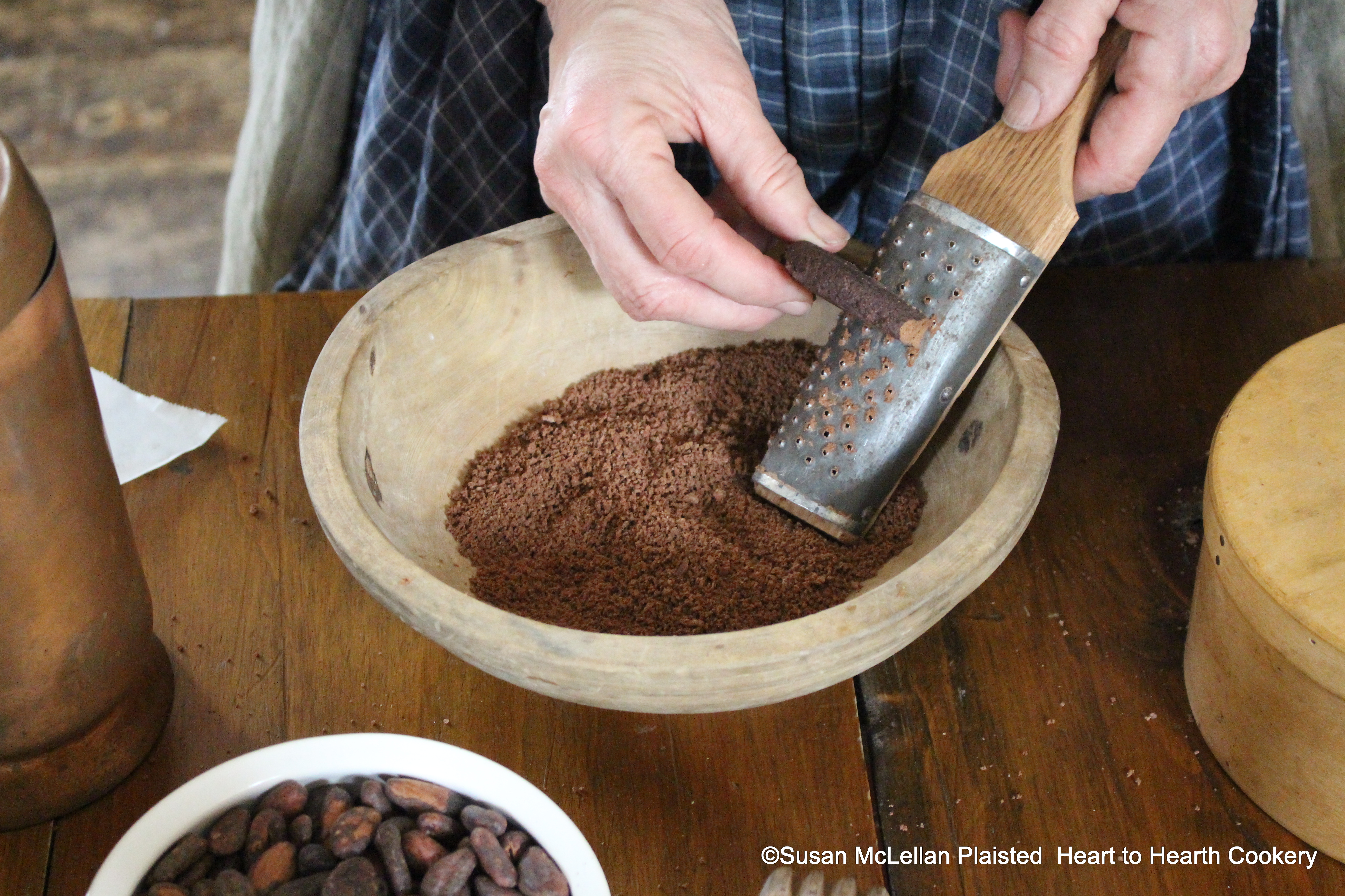The first step in preparing the drinking chocolate from the receipt (recipe) To make Chocolate is to grate a hardened chocolate cake. Cool hands is a plus for this process for if the cake starts to melt under warm fingers or from the heat from the friction of grating, the grating process has to halt to allow the heat to subside and resume after a break.