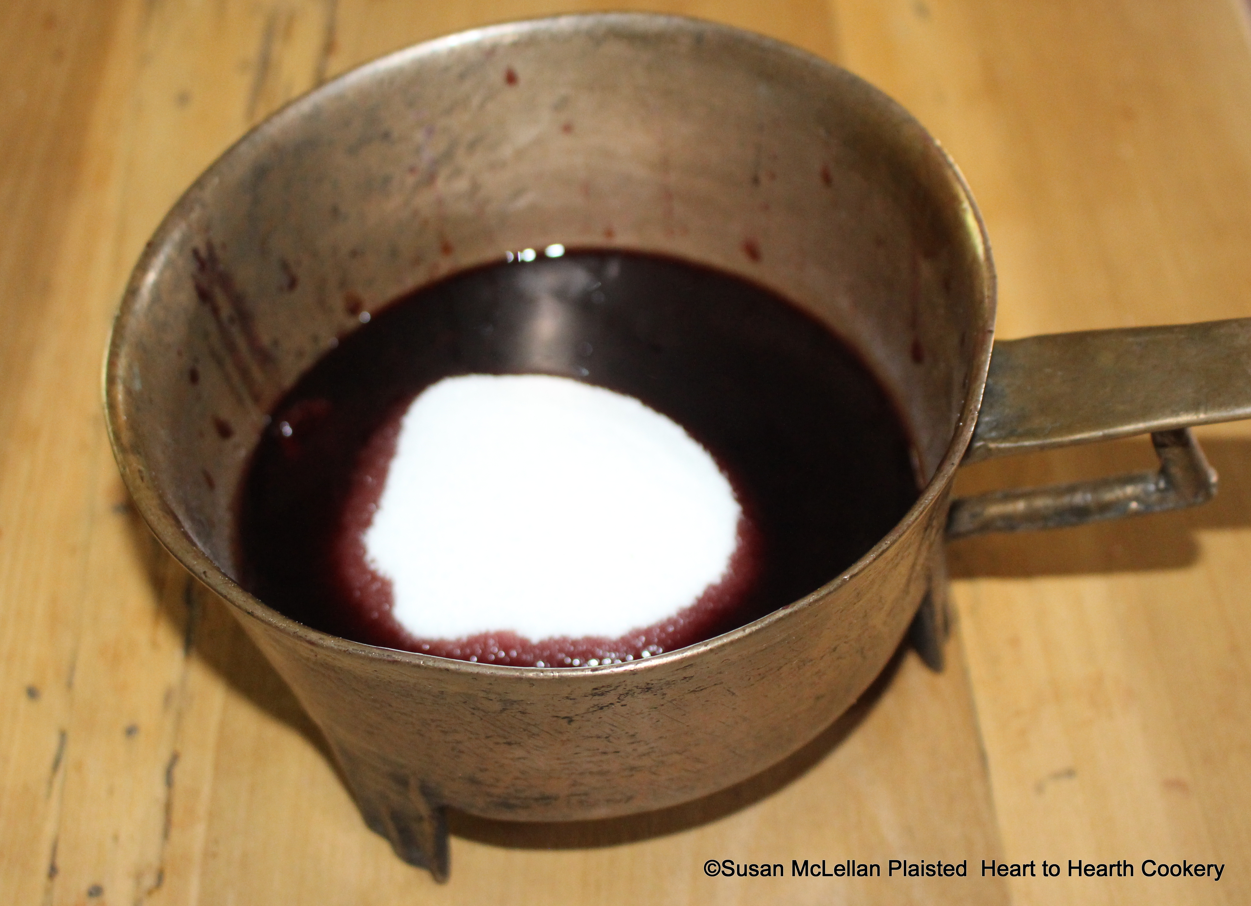 After the liquor from the bruised cherries has been strained through a cloth into a posnet for the receipt (recipe) To preserve Cherries put one third of the weighed sugar into the red sirup & so soone as the Sugar is melted take if off the fire, & scum it clean.