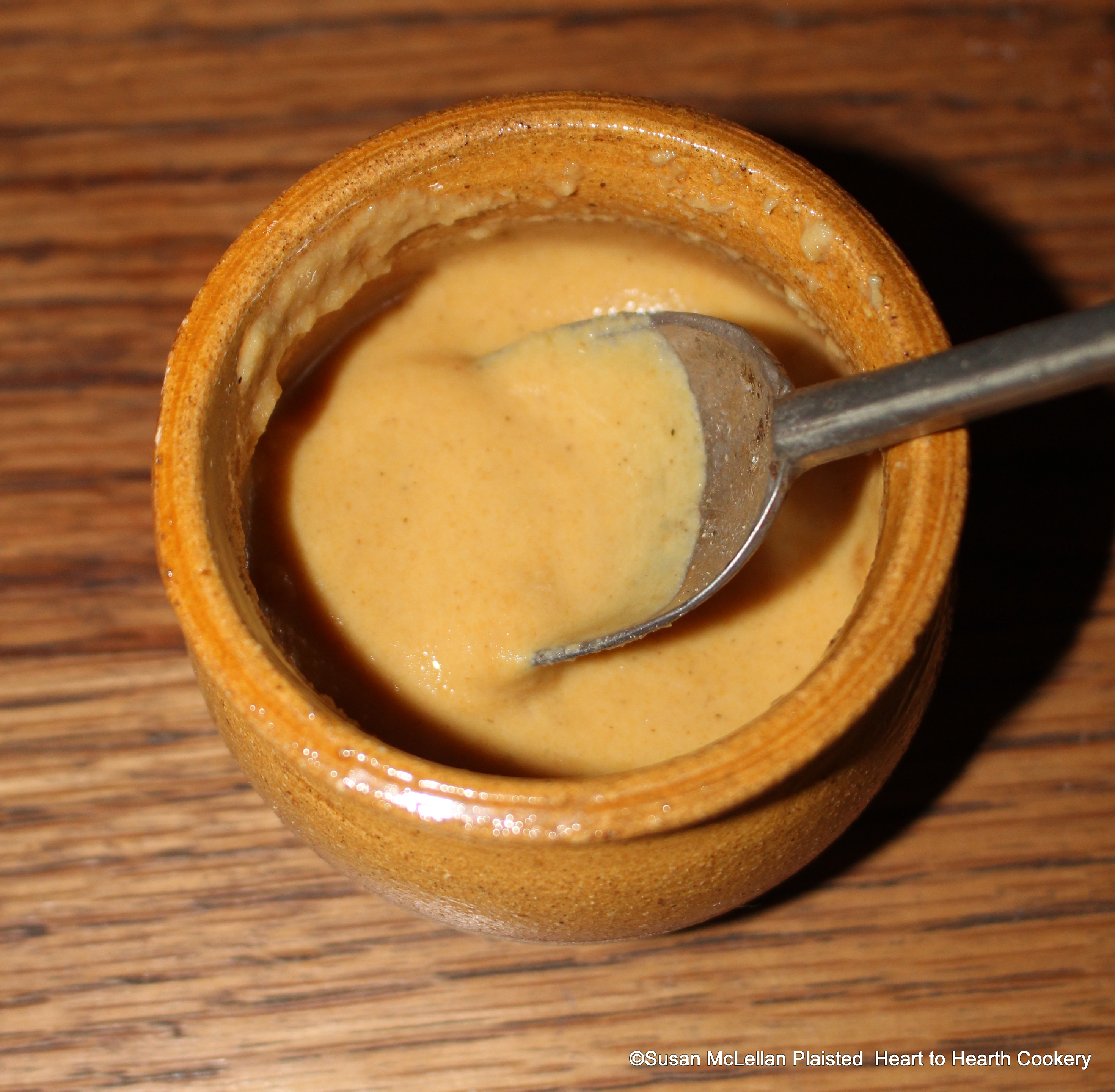 The receipt (recipe) To pickle Peaches called for a Pint of the best well-made Mustard. I used E. Smith’s 1725 receipt for making the mustard: grind the seed into flour and mix the flour with white wine vinegar. The flour was made by grinding mustard seed.