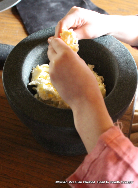 After the curd has been drained from the whey for the receipt (recipe) To make Pretty Little Cheesecurd Pudding put the curd into a Mortar. The hands in the picture are those of my six year old granddaughter as she is breaking up the curd after it was put in the mortar.