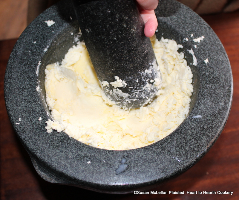After the curd has been crumbled into a mortar for the receipt (recipe) To make Pretty Little Cheesecake Pudding, beat it with half a pound of fresh Butter with a pestle. Beat till the butter and curd are well mixed.