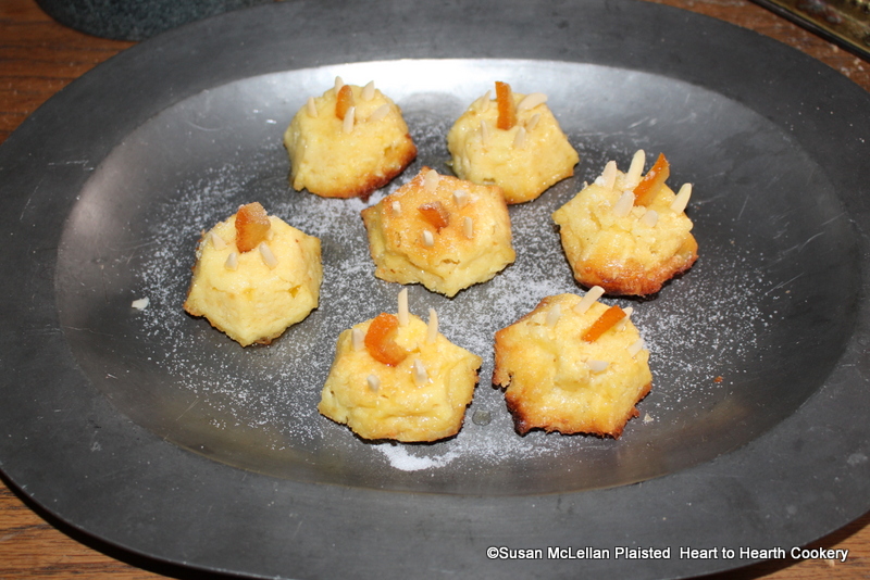 After the receipt (recipe) To make Pretty Little Cheesecurd Pudding is baked in patty-pans, turn them out into a Dish, cut Candied Orange-peel into little narrow Bits, about an Inch long, and blanch Almonds cut in long Slips, stick them here and there on the Tops of the Puddings, just as you fancy; pour melted Butter with a little Sack in it into the Dish, and throw fine Sugar all over the Puddings and Dish. They make a pretty Side-dish.
