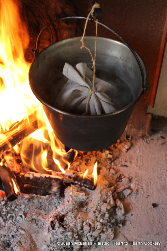 After the asparagus has been cut in small pieces for the receipt (recipe) An Amulet of Asparagus blanch your asparagus. In order to remove all the small pieces of asparagus easily from the kettle of boiling water, the pieces were put into a pudding bag (a square of linen) and tied to the trammel so the bag would not touch the bottom of the kettle. After a few minutes, the asparagus is blanched and the pudding bag is removed and all the pieces of asparagus placed at once in a colander.
