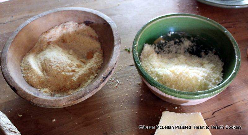 After a half pound of parmesan cheese has been grated for the receipt (recipe) A made dish of Pamezant then grate as much Manchet. The grated bread crumbs are on the left in the picture and parmesan cheese on the right.