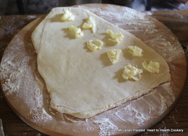 The next step for the receipt (recipe) Apricot Puffs is to make a nice puff-paste and I used Briggs, 1788 receipt Puff-Paste: Take a quarter peck of fine flour and rub in a pound of butter…make it up into a light paste with cold water, stiff enough to work it up…then roll it as thick as a crown piece, put a layer of butter in lumps as bit as a nutmeg all over it, sprinkle a little flour over it, and double it, roll it out again, and double it three or four times, then it will be fit for use.