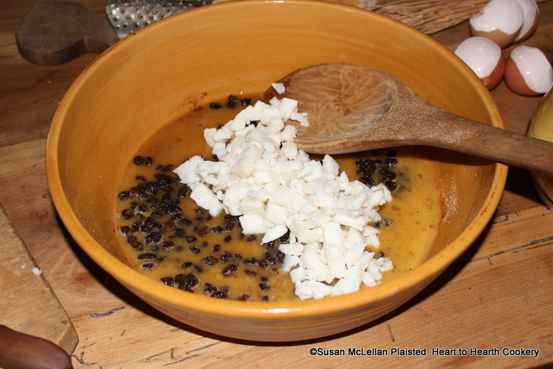 After the grated nutmeg has been added to the beaten eggs, sugar, rosewater and currants for the receipt (recipe) To make little plum puddings: My Lady How’s receipt 2 handfuls of Beefe suet shred small is next.