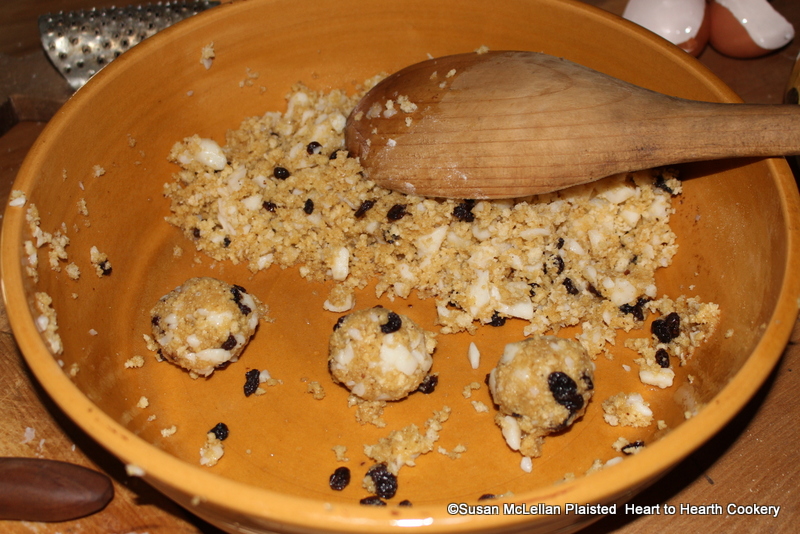 After two handfuls of beef suet have been added to the eggs, sugar, rosewater, currants and nutmeg for the receipt (recipe) To make little plum puddings: My Lady How’s Receipt next is a little salt and grated bread enough to make it stiff to wrap in balls.