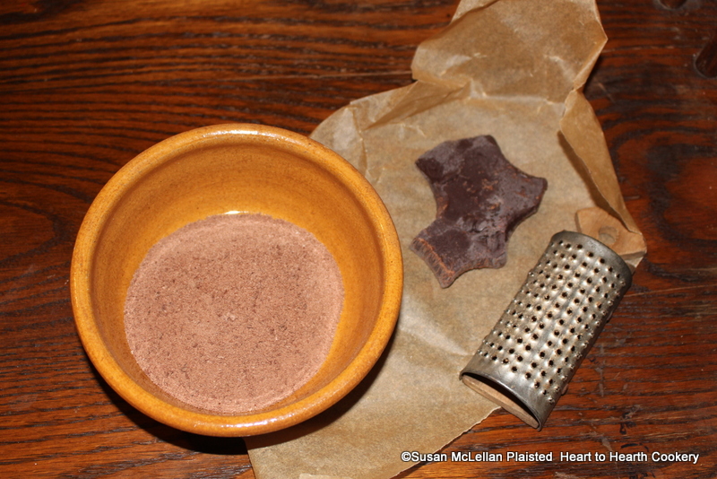 After the double-refined sugar has been beaten and sifted fine for the receipt (recipe) Chocolate Puffs scrape into it one ounce of chocolate very fine. I used a 100% pure chocolate cake prepared on my metate from roasting fermented raw cacao beans.
