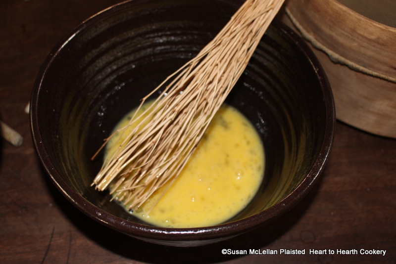 After the boiled, peeled, mashed skirrets have been rubbed through a sieve for the receipt (recipe) Skirret Fritters add four eggs beat well. Since I am preparing half the receipt, I beat two eggs.