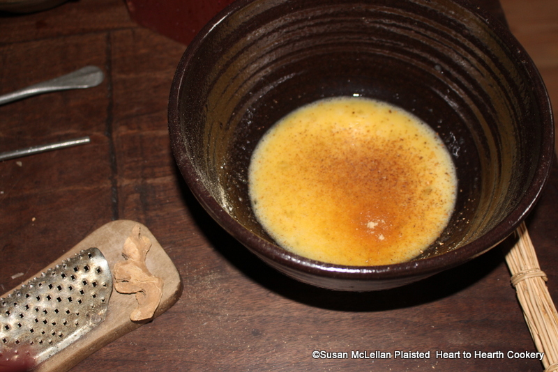 After putting grated nutmeg to the eggs and sugar for the receipt (recipe) Skirret Fritters put in ginger and mix it with a large spoonful of flour (if a large spoonful of flour is not sufficient put in more).