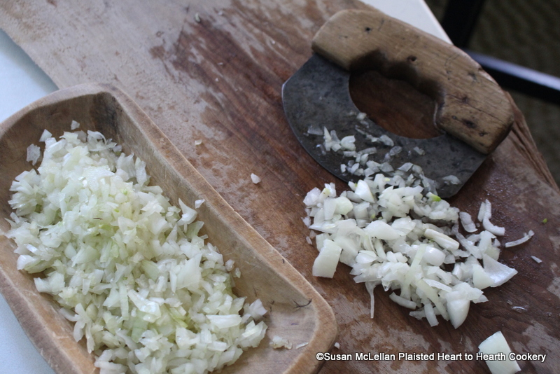 After a young lettuce has been washed and cut small for the receipt (recipe) A Ragoo of Asparagus peel a large onion and cut small. As shown in the picture, a rocker knife was used for this task.