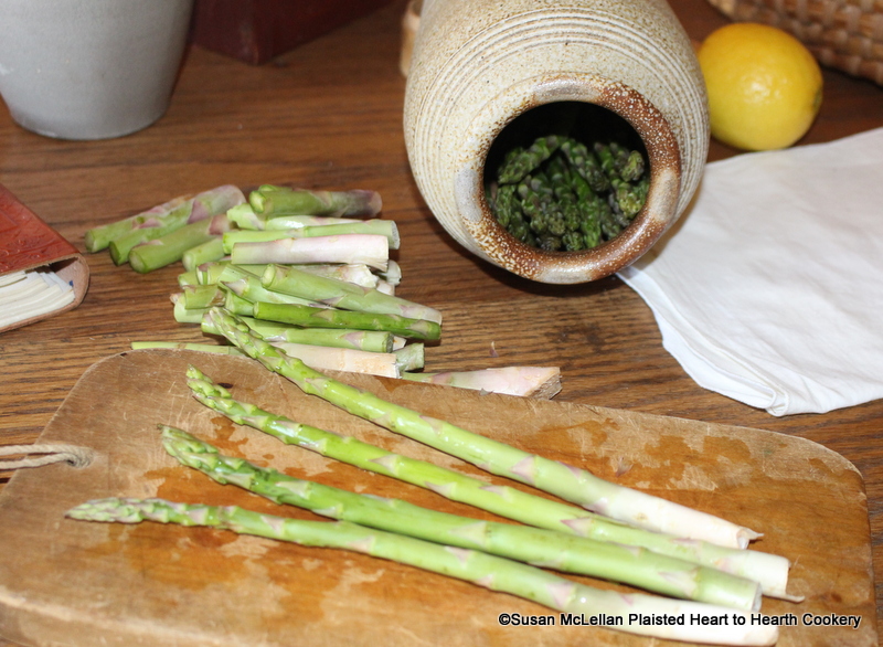 The first step to prepare the receipt (recipe) To preserve Asparagus is to cut off those Parts of the Asparagus that are not eatable. I actually was using my salt-glazed vessel to determine the amount to cut off to fit inside.
