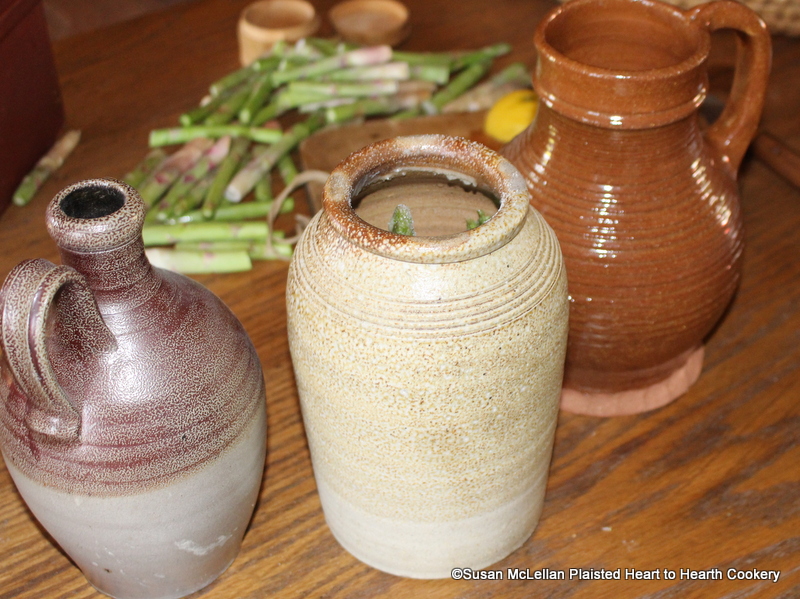 After the salt, cloves, and sliced lemon have been added to the salt glazed crock for the receipt To preserve Asparagus add as much water as vinegar. The water is in the red ware pitcher and the white wine vinegar in the stoneware.