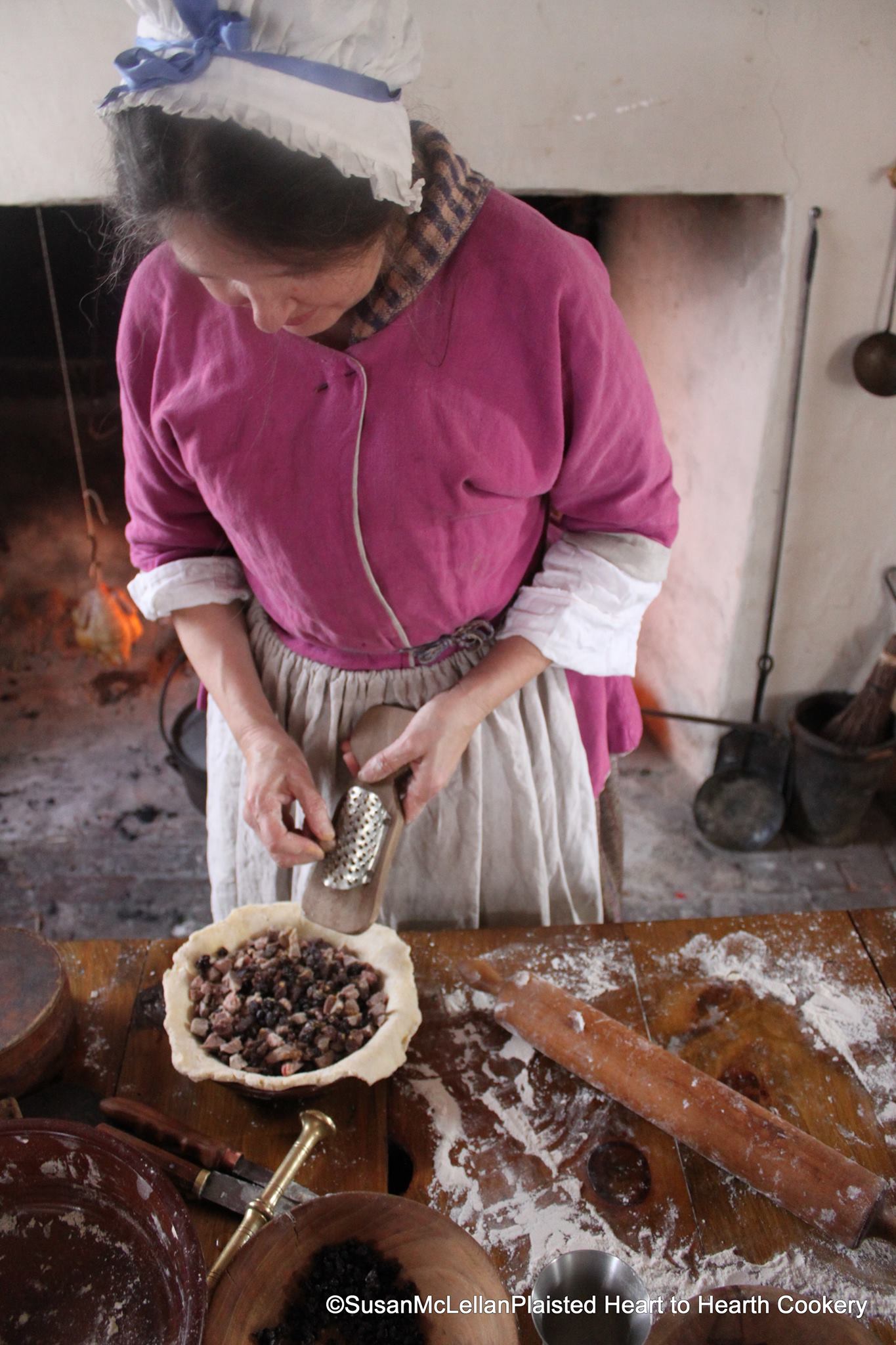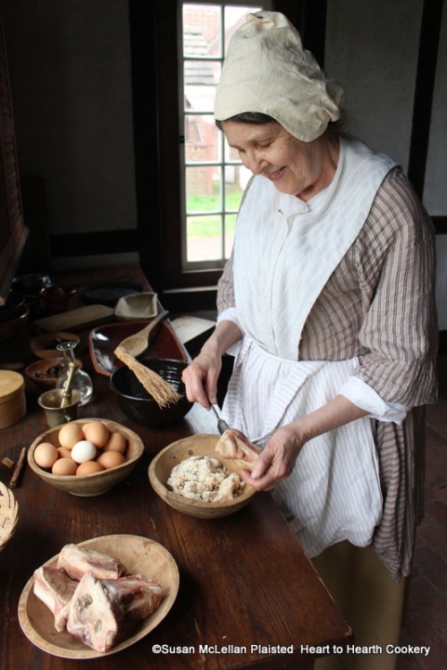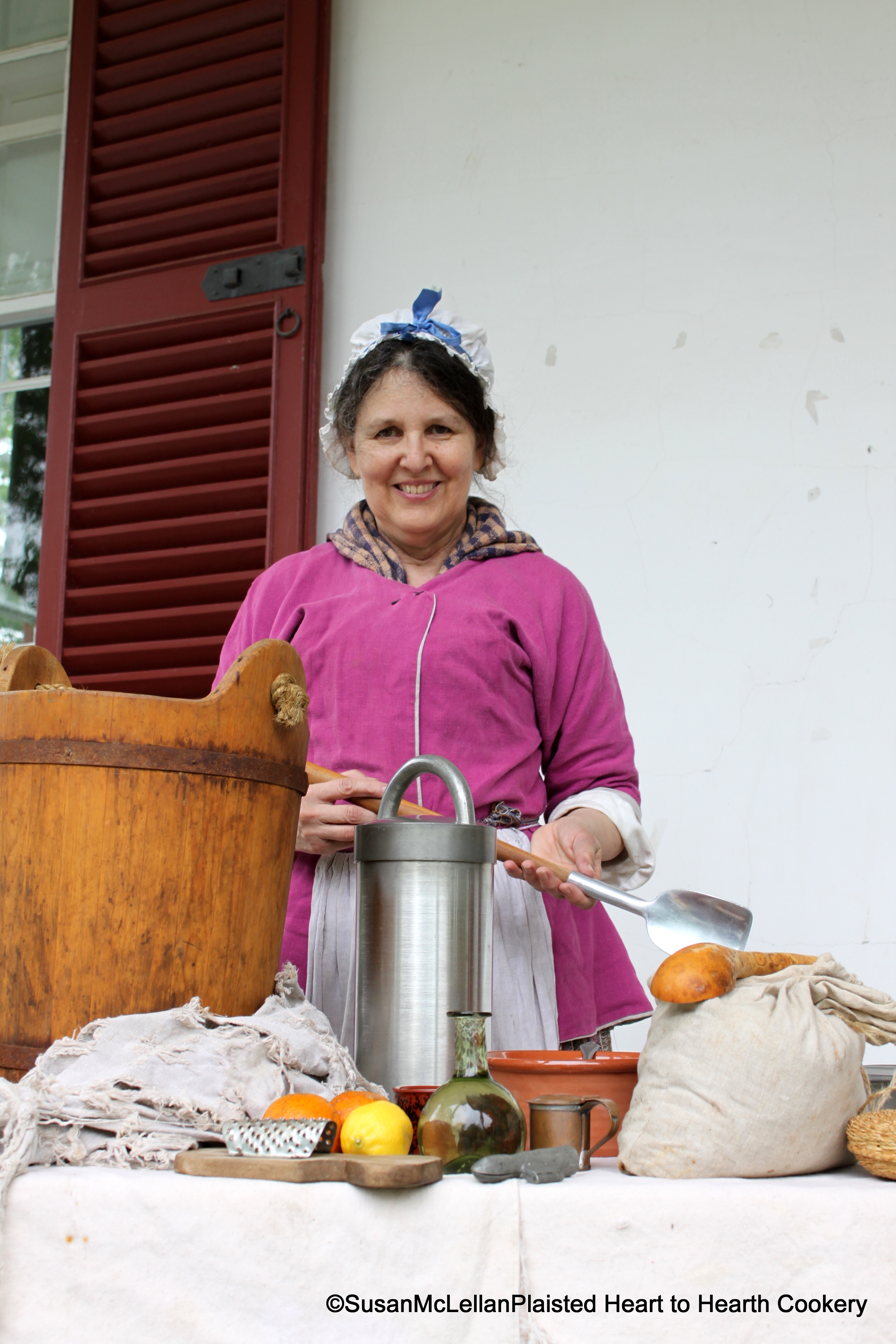 I, Susan McLellan Plaisted, am the Proprietress of Heart to Hearth Cookery, a food history business in Bucks County, Pennsylvania. I offer programs, presentations and demonstrations of 17th century through 19th century Colonial American and European cooking methods and practices, and receipts (recipes) as well as pre-European contact and post-European contact Native American Foodways