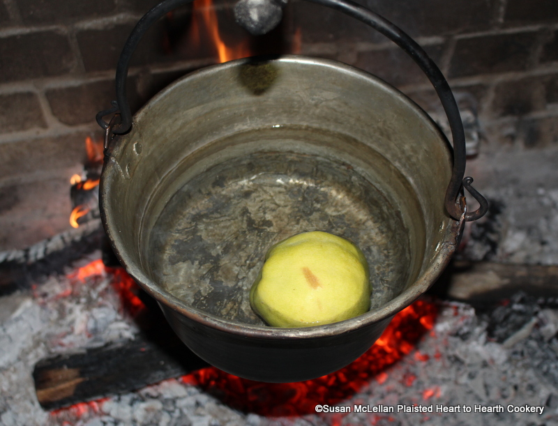 The first step in the preparation of the receipt (recipe) Quince Puffs: My Lady Sheldons Receipt is to take a fayre quince and boil it. The quince is a fruit that is so hard that it took over an hour until it was boiled tender.