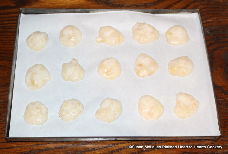 After the mashed quince pulp, sugar, and frothed egg white have beat together to look as white as snow for the receipt (recipe) Quince Puffs: my Lady Sheldons Receipt drop it with a spoon upon plates. My tin plate is covered with white paper prior to baking the Quince Puffs.