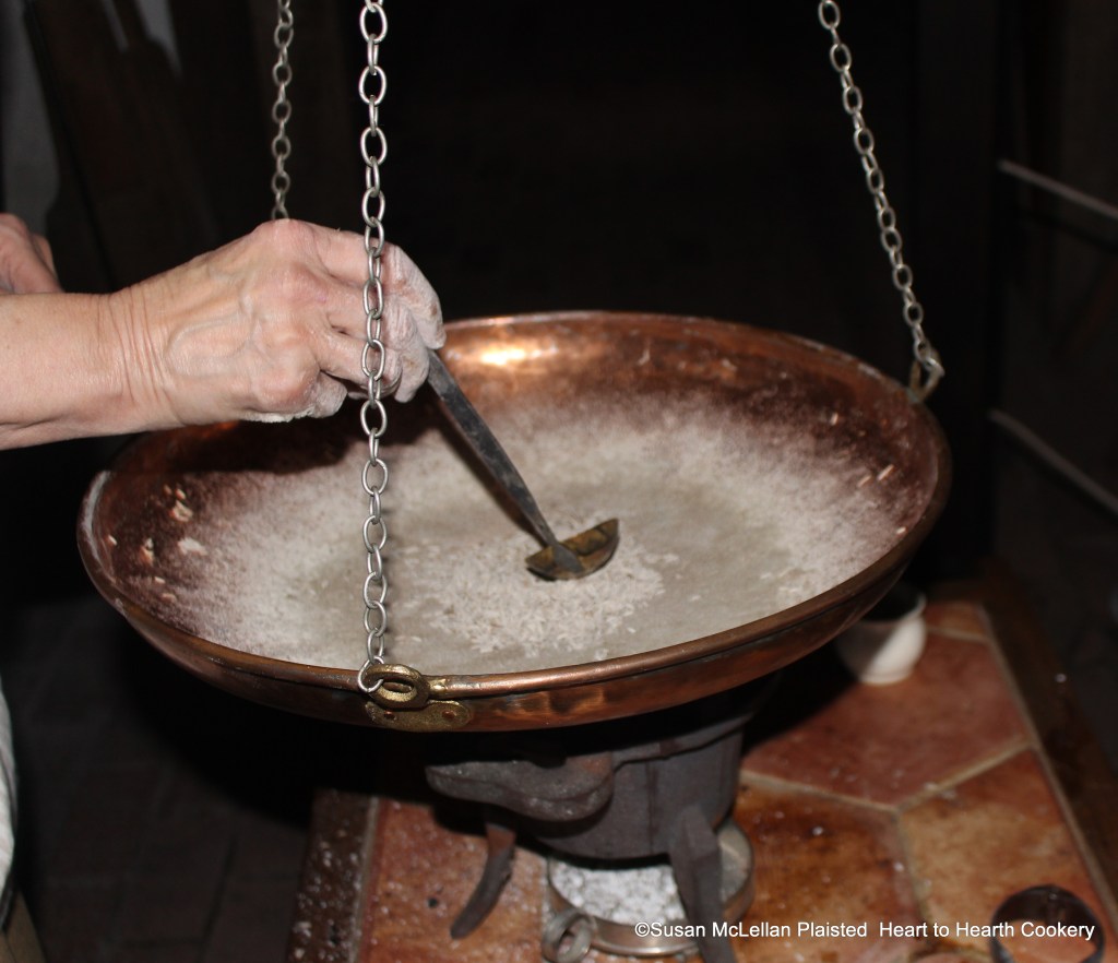 The most popular comfits in the 18th century were caraway comfits which are caraway seeds coated with multi-layers of sugar using a comfit pan. This demonstration requires the use of a brazier for the comfit pan and either another brazier or a hearth for preparing the sugar syrup. The process is fascinating to watch!