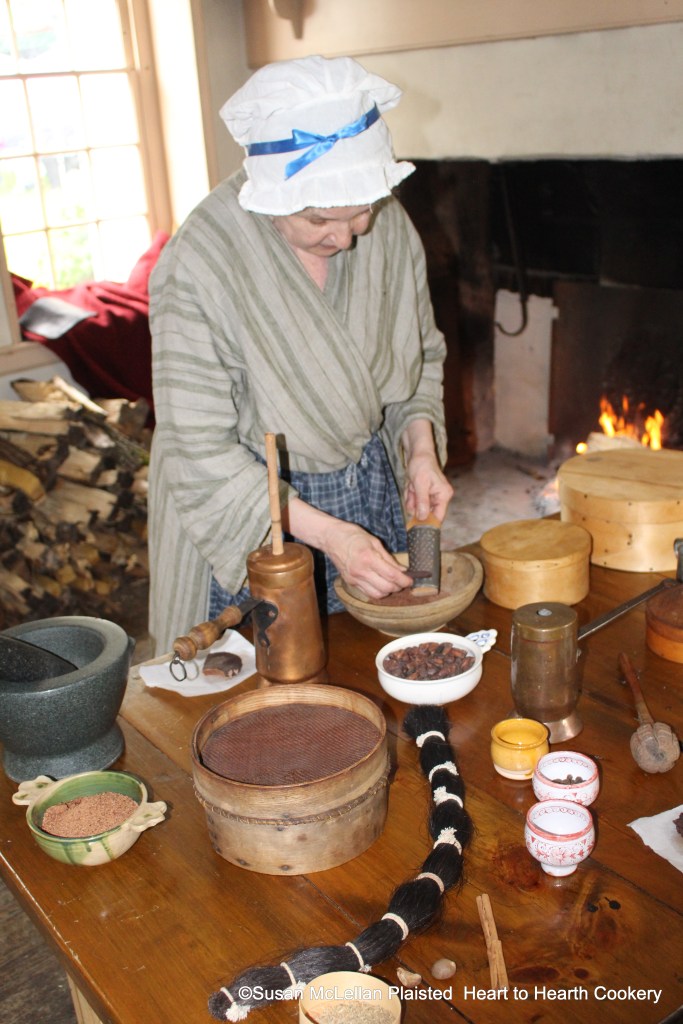 The story of gingerbread is presented as it evolves from a mixture of ginger and breadcrumbs to its present day form. The display consists of at least one example of a gingerbread receipt (recipe) from each century. This is one of my favorite programs and is well received by guests. There is an option to include samples of a gingerbread for guests and if a hearth, an appropriate gingerbread receipt (recipe) could be prepared.