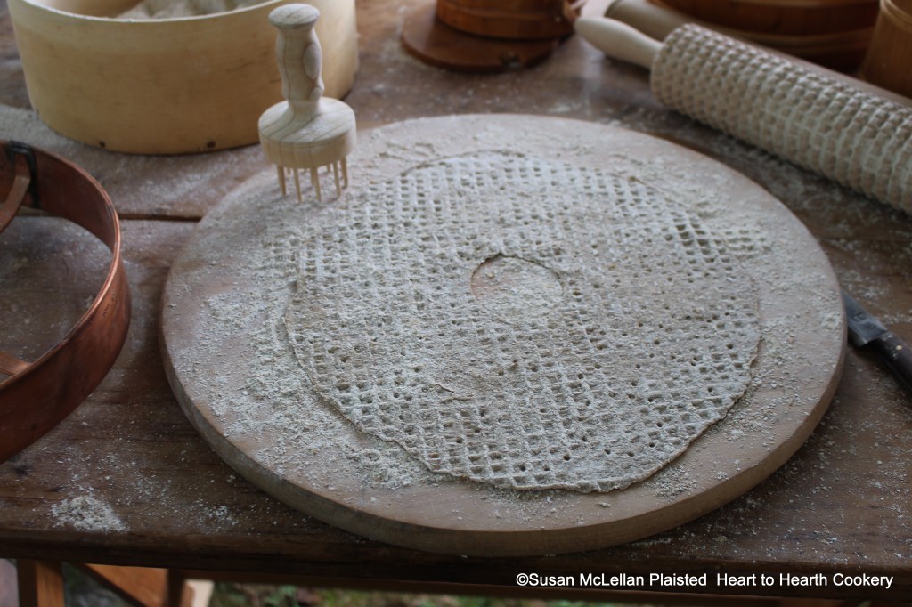 The preparation of the Swedish traditional bread, Knackebrod, is demonstrated using traditional tools with the receipt (recipe) from an original 18th century receipt book on display.